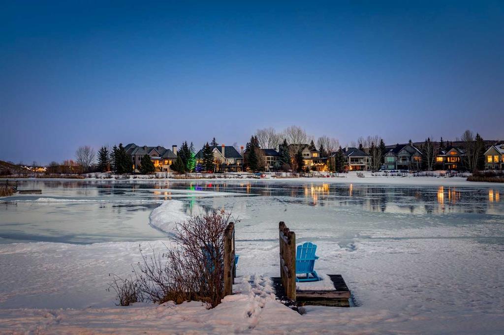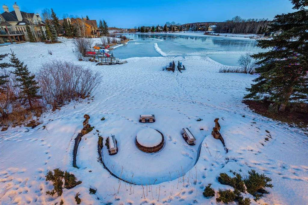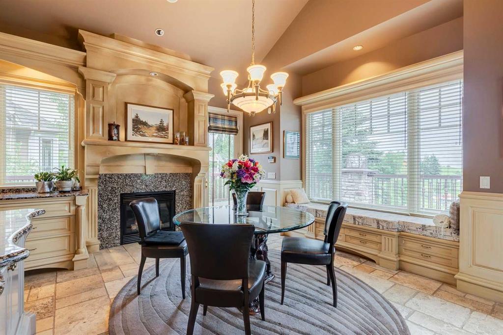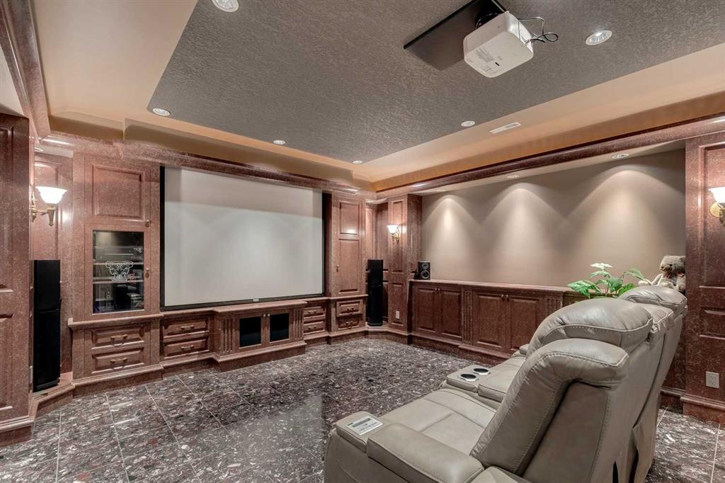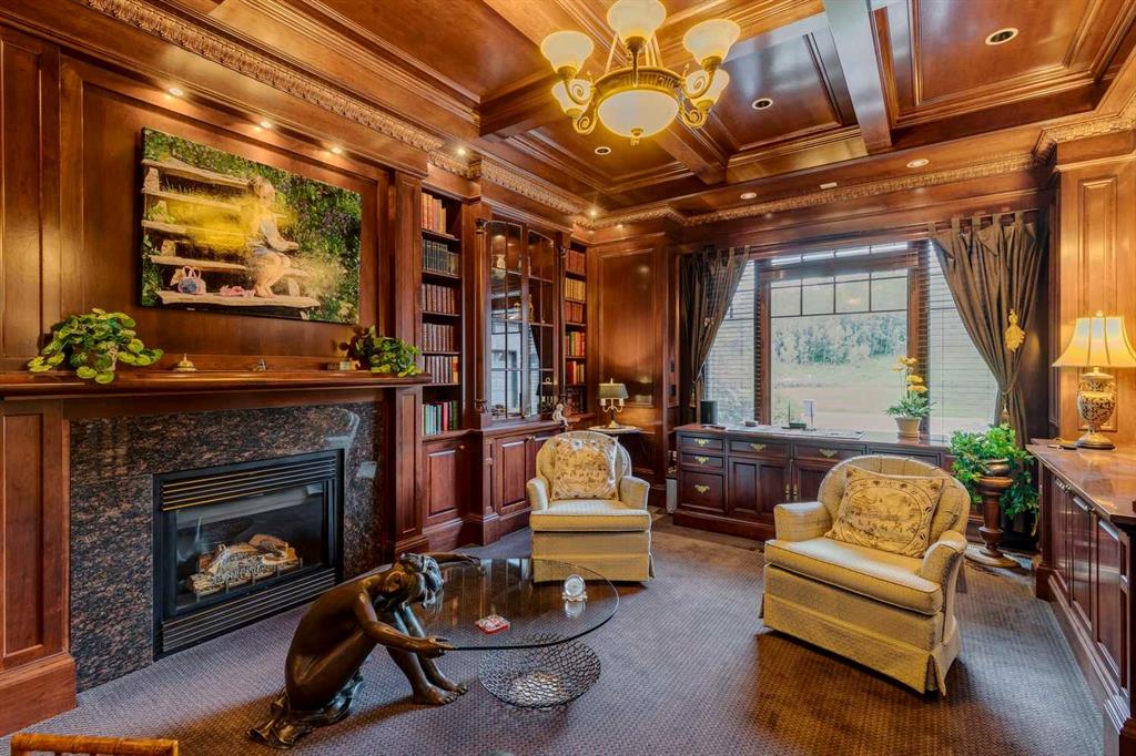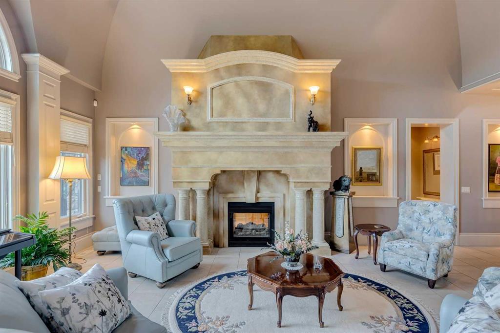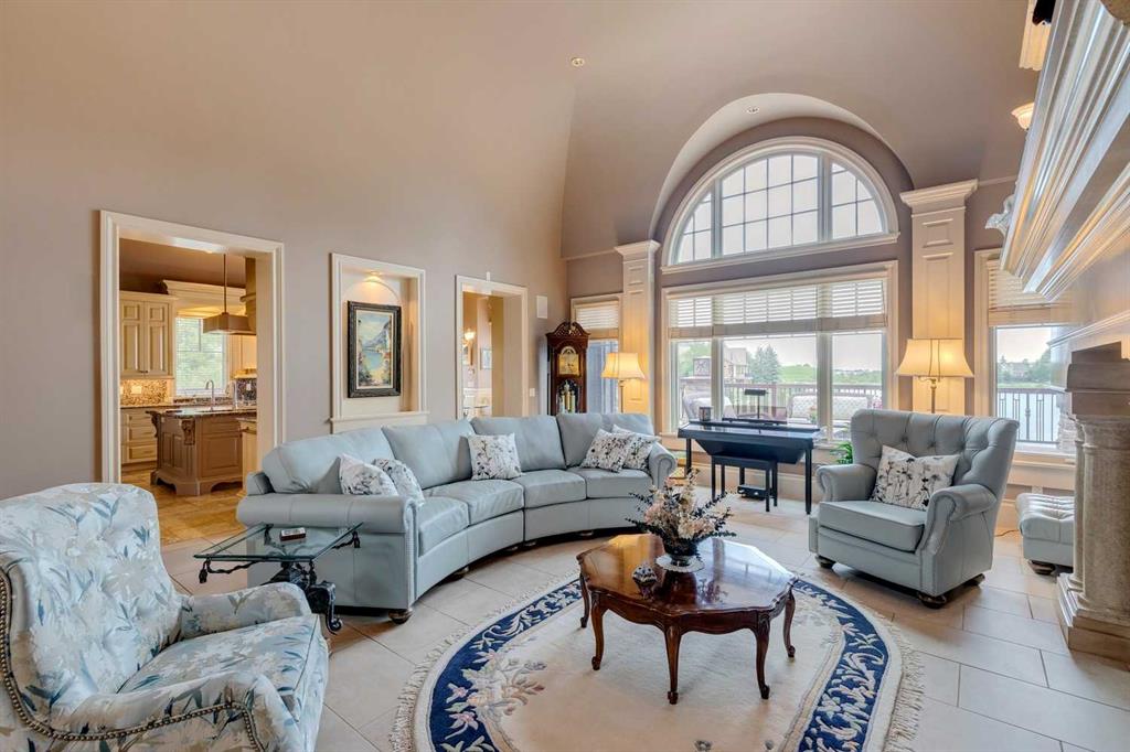 Discover one of the most iconic estate homes offered in prestigious Elbow Valley Estates—an extraordinary custom residence that combines European grandeur, architectural artistry, and exceptional craftsmanship. Perfectly positioned on a private lakefront lot, this executive walkout bungalow offers over 8000 square feet of exquisitely developed living space, designed with precision over years of thoughtful planning and executed by master artisans. From the moment you enter the grand foyer with its coffered and barrel-vaulted ceilings, it’s clear this is a home unlike any other. The main level features a sun-drenched great room with a double-sided fireplace and expansive windows framing unobstructed lake views. The heart of the home is the richly appointed ‘French Manor’ inspired kitchen—equipped for grand-scale entertaining with granite countertops, top-tier appliances including a Sub-Zero refrigerator, gas range with pot filler, two dishwashers, and a walk-in pantry. A cozy breakfast nook with fireplace and access to the expansive upper deck provides the perfect spot for morning coffee overlooking the water (with handicap access). An elegant formal dining room with custom glass cabinetry, a fully paneled library/office with fireplace, and a large laundry/sewing/hobby room complete the main level. A reverse osmosis water system is conveniently located in the craft room. The luxurious primary bedroom is a private sanctuary, featuring a vaulted sleeping area, two-way fireplace, and a spa-inspired circular ensuite with bubbling soaker tub, walk-in shower, dual vanities, and a generous dressing room with built-ins. The master bedroom also offers deck access to enjoy tranquil lake views. A versatile loft functions as a full office or creative workspace, complete with multiple workstations—ideal for today’s remote professional or growing family. The lower level is designed for recreation and relaxation, boasting an authentic English-style pub with a full wet bar, games room, media/theatre room, and three additional spacious bedrooms—each with their own private ensuite and walk-in closet. Three solariums enhance the lower level, offering a fully enclosed hot tub retreat, home gym, and peaceful sitting room, all flooded with natural light. This remarkable residence is equipped with countless thoughtful upgrades, including two newer air conditioning units, newer hot water tank and sump pump, new sinks and hardware in the craft room and kitchen . The property also features a recently serviced irrigation system. Designed for effortless living, this home includes hydronic in-floor heating on all levels, a dramatic central staircase, private elevator, and a heated triple garage. Every detail reflects unparalleled quality and meticulous attention throughout. Outdoor living is equally exceptional, with sweeping views of the lake and beautifully landscaped grounds—an entertainer’s dream and a private oasis.