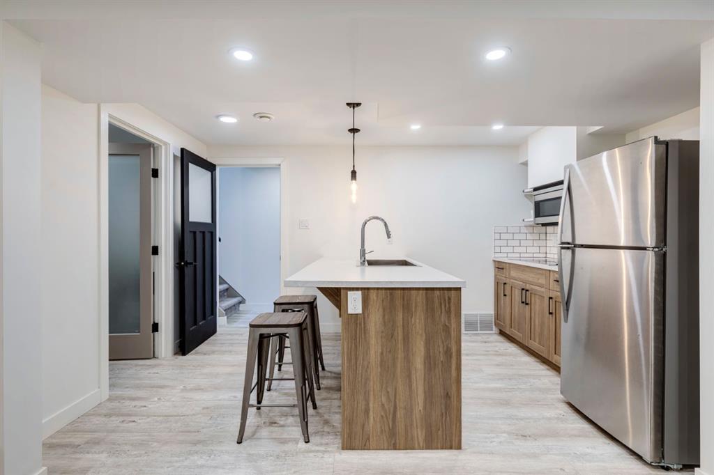 $50,000 PRICE REDUCTION! BY FAR THE BEST VALUE IN THE SURROUNDING AREAS! Welcome to one of Maple Ridge’s most desirable pockets, where active lifestyle meets bespoke luxury. This STUNNING, fully renovated bungalow is an entertainer’s dream, perfectly situated steps from Calgary’s top city-owned golf course and a large community green space. Enjoy unparalleled year-round recreation, from summer golf and winter sledding to ski-in/ski-out cross-country skiing right outside your door. Driving up, the home’s captivating curb appeal is instantly noticeable. The charming exterior features upgraded triple pane windows, defined by tasteful black trim, contrasting beautifully against the white stucco cladding and decorative archways. Step inside to be greeted by seamless front-to-back sight lines that flood the open-concept living space with maximum natural light. The heart of the home is the meticulously crafted gourmet kitchen, maximizing both functionality and style. It flows seamlessly through the spacious dining area, the manicured backyard, and the charming living room – anchored by two beautiful south facing windows. The primary suite offers a true sanctuary with a generous walk-in closet and a spa-inspired 4-piece ensuite featuring a sleek, curb-less shower. The main level is completed by two additional well-sized bedrooms, a modern 3-piece bathroom with ample storage, and a practical office nook. You’ll continue to be impressed by the fully developed basement. It hosts a massive wet bar that could also function as a second full kitchen (if desired), equipped with a sink, full-sized fridge, dishwasher, stove top, and microwave hood fan, plus an island with seating. The basement’s open floor plan is ideal for a media room, play area, or multi-purpose use. Two large additional bedrooms and a 3-piece bathroom complete this versatile living space. The outside presents a professionally landscaped backyard, maximized for multiple uses, including a poured concrete sitting area, a fire-pit zone, and grass space. It also provides secure trailer storage via the paved alley. The front detached garage is a mechanic or hobbyist’s dream, measuring a large 22’ x 23’, drywalled, insulated, and equipped with a sub-panel and 220V plugs. Complete with unmatched efficiency and peace of mind with updated hvac, electrical, plumbing, roofing, insulation, and so much more! Located on a quiet street with little to no traffic, this home provides a safe, mature neighborhood to call your own. **Be sure to view the full detailed UPGRADE LIST and 3D VIRTUAL OPEN HOUSE TOUR for a better look**