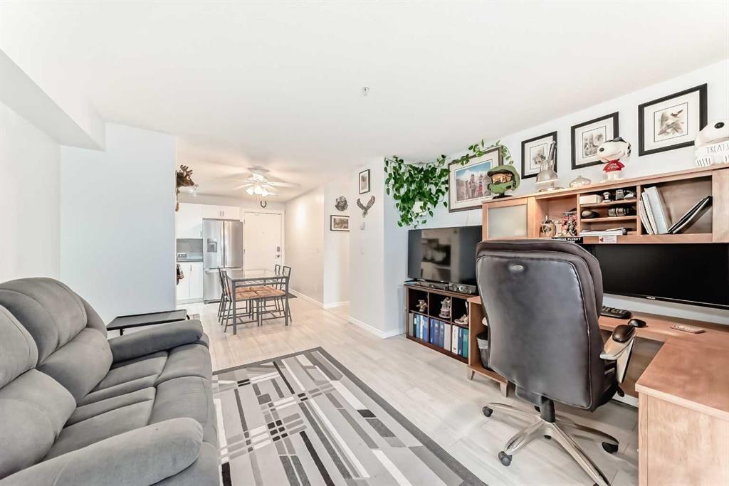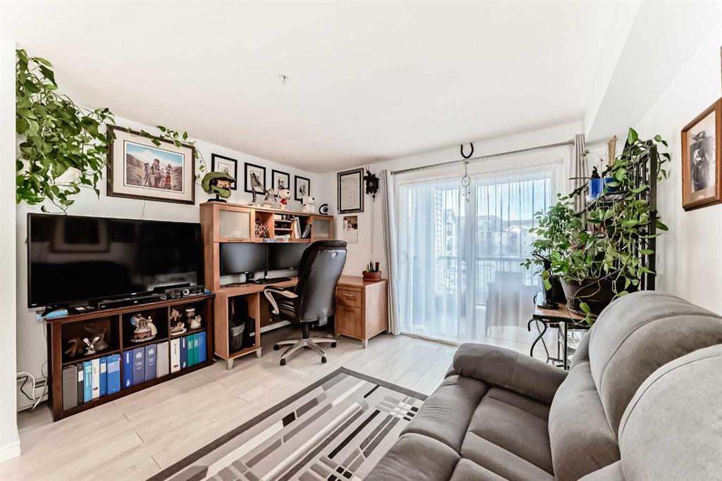Welcome to this beautifully renovated 1 bedroom plus den unit in the desirable community of Evergreen. Bright and inviting this home is filled with natural light and finished in clean, neutral colours throughout. The spacious living room features patio doors that open to a sunny west-facing balcony, perfect for relaxing in the evening with a beverage as the sun goes down. The large open kitchen has plenty of space for a dining table or even a future kitchen island, and is equipped with newer, modern stainless steel appliances, an upgraded 3-rack dishwasher, and built-in cupboard organizers for excellent storage and functionality. The showhome-like bathroom is finished with luxurious marble tile, a dimmable anti-fog mirror, and contemporary fixtures. The generous den provides flexible space for a home office, guest area, or additional storage. This unit is clean, bright, and truly move-in ready with very flexible possession available. The parking stall is conveniently located near the front door, with ample additional street parking available. Ideally located, this home is walkable to everyday shopping, cafes and restaurants nearby, offers easy access to the ring road, and is just a short walk to Fish Creek Park. An excellent opportunity to own a stylish, well-located home in a smaller, more intimate building with 2 elevators. Just move right in!