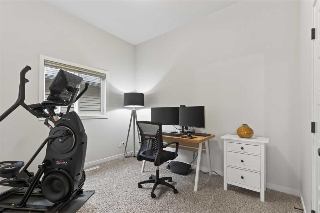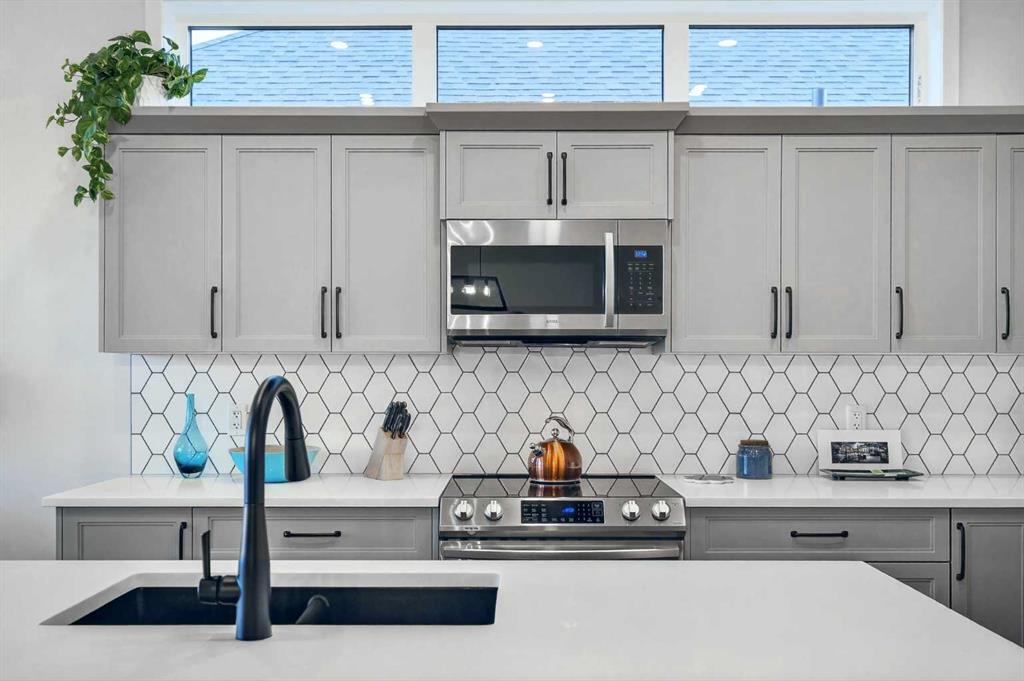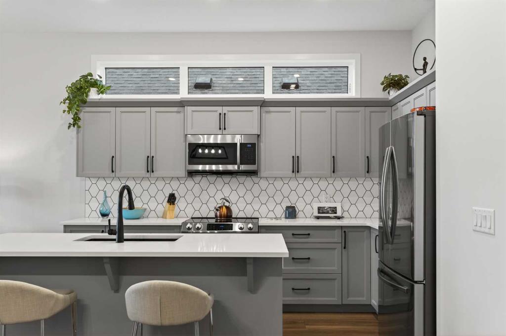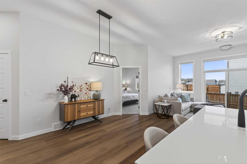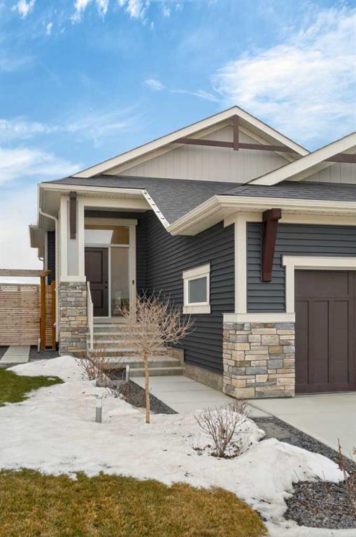 Welcome to 125 Amery Crescent – an immaculate modern bungalow in the sought-after Vista Crossing neighbourhood of Crossfield with quick access to Airdrie and Calgary. This beautifully designed home offers a comfortable and thoughtful design, perfect for both everyday living and entertaining. Showing like-new throughout, this stunning move-in ready home is beautiful both inside and out with professional landscaping completing the west-facing backyard. Stepping inside, you’ll be greeted by an open-concept layout that seamlessly connects the main living areas with soaring ceilings and a bright living space all year round. Large windows flood the space with natural light, highlighting the bright and airy feel throughout. The timeless kitchen is complete with grey shaker cabinetry and white quartz countertops with a large central island that provides additional seating space. The kitchen opens to the main living room and dining areas – creating the perfect space for everyday living and entertaining. A central fireplace with TV hook-ups anchors the main living area with a wall of windows and patio doors opening to the west-facing backyard. The spacious primary suite is a true retreat, complete with a luxurious four-piece ensuite including dual sinks with endless storage space and a walk-in shower with tile complete to the 10′ ceilings. Completing the primary suite is a generous walk-in closet. A second well-sized bedroom spanning ~10’x12′ and a full bathroom with soaker tub, as well as a laundry room complete the main level. Thoughtful details and warm neutral tones give the home a welcoming sense of elegance and provide the perfect single-level living space. The expansive basement is complete with bathroom rough-in and provides ample space for a future recreation room, bedroom, bathroom and storage area. Completing the home is a double attached garage that is fully drywalled with a finished floor – ensuring a clean and seamless living space throughout the entire home. Outdoors, enjoy a sunny west-facing yard perfect for summer barbecues or quiet evenings under the sky. The professionally landscaped exterior features a stone patio that spans the width of the property and overlooks the backyard with lighting features, 4-zone irrigation and a beautiful front entryway with flowering shrubs – offering a fully complete exterior. If the summer heat becomes too hot, the central A/C will keep you comfortable all summer long. This move-in ready home is immaculate both inside and out – presenting the perfect bungalow for those looking to downsize without compromise in quiet and charming Crossfield. *Virtual tour available upon request.