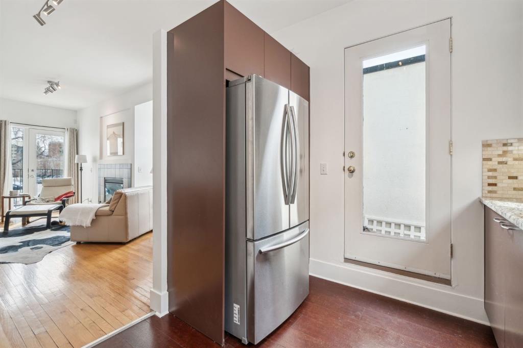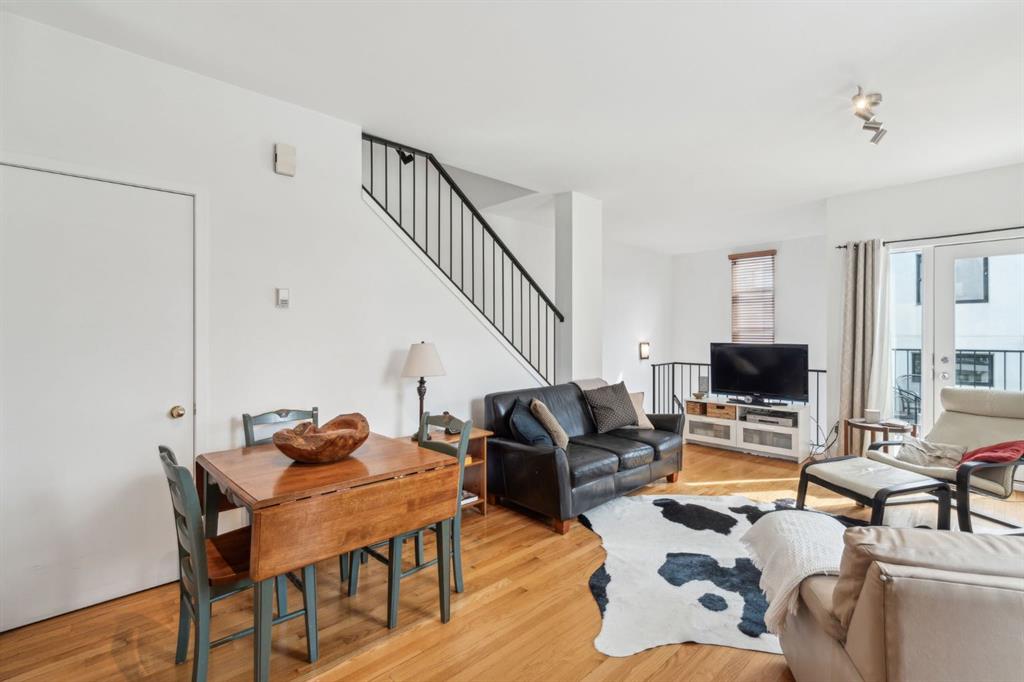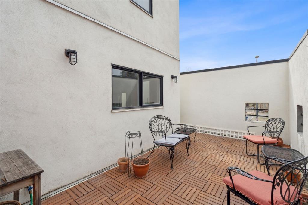 Award-winning design by Sturgess Architecture, this contemporary two-story end-unit townhouse sits on a quiet street in the highly sought Beltline area. The white stucco facade with a flat roof fronts a walled, landscaped open courtyard and adjoins a dedicated street park, enhancing curb appeal and urban serenity.