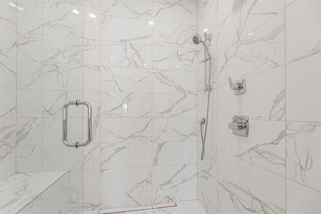 The large primary bedroom is conveniently located off the living room and offers a two-sided walk-through closet leading to the luxurious ensuite, featuring a marble double vanity, Dietra heated tile floors, and an oversized shower with built-in bench seating.