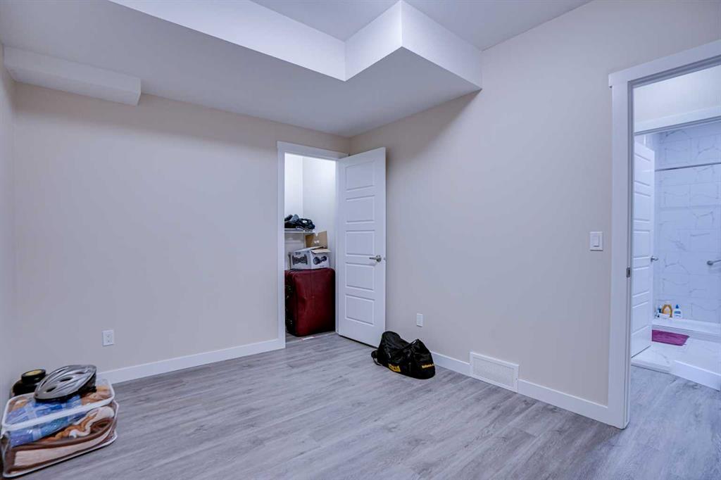 Downstairs, the 2-bedroom basement suite (illegal) includes a separate exterior entrance, 9-foot ceilings, an open living area, its own laundry, and extra storage. The basement kitchen features full-height cabinetry, quartz countertops, stainless steel appliances, and a double sink. Two generous bedrooms share a 3-piece bathroom with a walk-in shower, creating a comfortable and independent space.