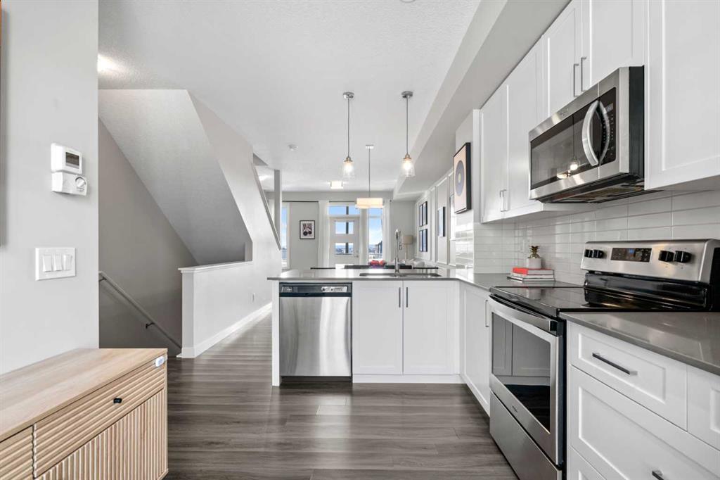 ***OPEN HOUSE Saturday Mar 28th 12pm-3pm***This beautifully designed town home effortlessly combines modern style with everyday comfort. Featuring an open-concept layout, 9’ ceilings, and an abundance of natural light, the main floor feels bright, spacious, and inviting throughout. You’ll appreciate the seamless flow of laminate flooring, a convenient powder room, and a generous front closet. The contemporary kitchen is both functional and stylish, showcasing crisp white cabinetry, quartz countertops, and stainless-steel appliances. A welcoming breakfast bar offers the perfect spot for casual dining, while the adjacent dining area easily accommodates a full six-person table. The spacious living room is ideal for both relaxing and entertaining, highlighted by a stylish feature wall that adds a touch of sophistication and warmth. Step outside to your private south-facing balcony, where you can enjoy sunny afternoons and effortless summer BBQs. Upstairs, you’ll find a well-designed dual primary layout, with each bedroom featuring its own private ensuite and ample closet space—perfect for guests, roommates, and kids. Adds privacy and hides the mess! A large linen closet and convenient stacked washer and dryer complete the upper level. Additional highlights include air conditioning for year-round comfort, and the convenience of a double attached tandem garage. Out back the unit has views of the courtyard! Ideally located close to the YMCA, South Health Campus, schools, restaurants, theatres, and shopping, with quick access to both Deerfoot and Stoney Trail—making any commute a breeze. With low condo fees of just $313.82/month, this move-in ready home offers exceptional value and lifestyle. A must-see opportunity you won’t want to miss.