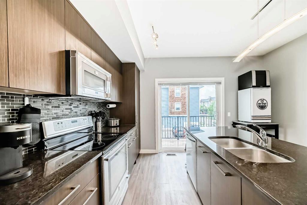 Step into this well-kept 2 bedroom 2 bathroom townhouse, located in a LOW DENSITY and WELL MANAGED complex and perfectly situated at the corner of Kings Heights Gate and Ravenswood Drive, just minutes away from all major amenities and conveniences. You’ll LOVE the entry level with a bright den, a 2-piece bath, and direct access from and to the courtyard and your garage…perfect for your home office. The main floor welcomes you with a bright open layout, highlighted by granite counters, a large kitchen island, modern stainless steel appliances, and an inviting dining area with a stunning feature wall. Upstairs, enjoy two spacious bedrooms and a convenient laundry area featuring PREMIUM stacked machines. With great natural light and a sense of privacy throughout, this home is ideal for first-time buyers, downsizers, or investors. Pets are allowed (with board approval) and condo fees are very reasonable. Move-in ready and just minutes from parks, schools, and shopping—don’t miss this one!