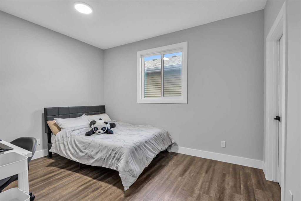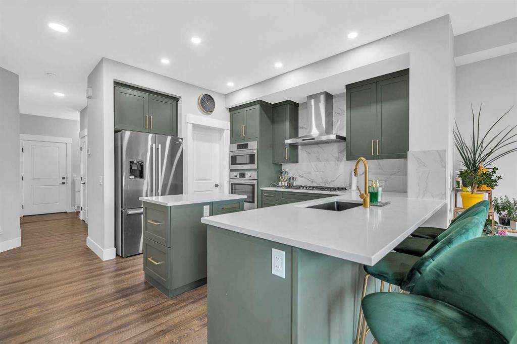 The main floor features a sun filled open layout with upgraded LVP flooring and a gorgeous chef’s kitchen equipped with Bosch appliances, a gas cooktop, hood fan, quartz countertops throughout, and a Silgranit upgraded sink. The kitchen flows seamlessly into the bright living and dining areas, all overlooking the peaceful green space behind the home. This level also includes a main floor bedroom and a full four piece bathroom, offering exceptional flexibility for guests, extended family, or a private workspace.