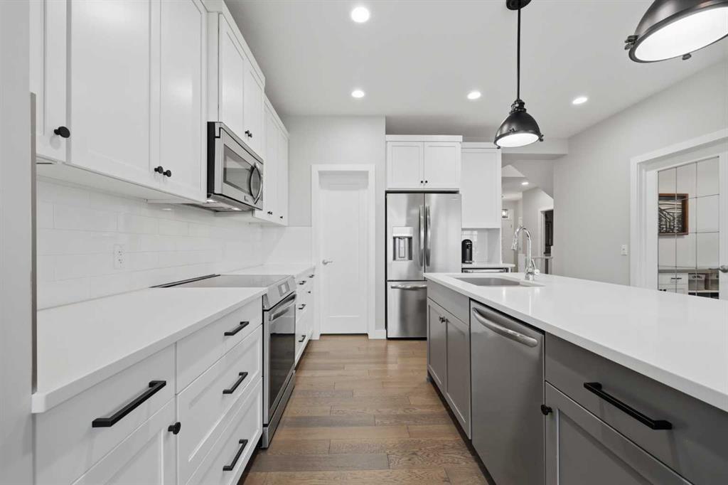 Welcome to one of Walden’s premier addresses, offering more than 3,000 sq ft of thoughtfully planned living space. Every detail has been carefully elevated beyond builder standards. Positioned on a rare pie-shaped lot at the end of a quiet cul-de-sac and backing onto expansive green space, this home offers privacy, unobstructed views, and a strong sense of community in an exceptional setting. Natural light fills the main floor, highlighting the contemporary two-toned kitchen with premium appliances, quartz countertops, a composite granite sink, designer backsplash, and a spacious pantry for simple organization. The living room is anchored by a cozy gas fireplace and features bright south-facing windows. The dining area benefits from a custom feature wall as an eye-catching centrepiece and easy access to the elevated deck with peaceful views. The entry provides built-in storage and hooks to keep everyday life organized. A main floor half bath and a versatile room with built-in shelving offer flexibility, ideal for a private home office or study. Upgraded pot lights and a curated lighting package create a warm, polished ambiance throughout. A wired Sonos Home sound system delivers premium audio throughout the home, perfect for entertaining or everyday enjoyment. Upstairs, the primary bedroom features a large 4pc ensuite with quartz countertops, upgraded fixtures, and a walk-in closet. The bonus/family room impresses with large windows, a custom built-in desk with drawers, and a decorative wood feature wall, perfect for media, play, or work. Two additional spacious bedrooms and a full 4pc bathroom provide comfort for your entire family. The upper laundry room includes shelving for convenient storage and easy routines. The fully developed walk-out basement offers flexibility, with a generous bedroom, a full 4pc bathroom, and direct access to a concrete patio and beautifully landscaped, south-facing yard. The pie-shaped lot ensures the space is utilized where it matters most, resulting in a private backyard retreat with unobstructed field views. A triple tandem garage is a rare asset in Walden, perfect for extra vehicles, additional storage, or a dedicated workshop. Full central A/C and Wi-Fi-controlled LED holiday lighting on the home’s front add seasonal charm. Tucked at the end of a quiet cul-de-sac, this home is an exceptionally rare property in an established, amenity-rich community. This is the one discriminating buyers have been waiting for.