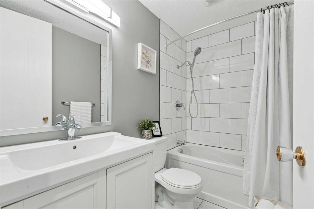 Pride of ownership is evident in this well-maintained end-unit bungalow, offering comfortable living, thoughtful upgrades, and a private setting backing onto a large green space. The main level features a bright and inviting living room with a large window that fills the space with natural light. The renovated kitchen showcases modern white cabinetry, quartz countertops, and stainless steel appliances. The adjacent dining area provides direct access through sliding patio doors to the fully fenced private backyard, where a low-maintenance concrete patio creates the perfect space for relaxing or entertaining. A rear gate offers convenient access to the expansive shared green space. Two well-sized bedrooms and a lovely 3-piece bathroom complete this level. Downstairs, the fully developed basement adds exceptional living space with a massive rec room/flex area – ideal for a second family room, home office, or whatever suits your lifestyle. This level also includes a second 3-piece bathroom, a large laundry and storage area, an easily accessible utility room, and additional storage space. FEATURES INCLUDE: triple-pane windows (5 years), upgraded attic insulation (5 years), kitchen appliances (3 years), a tankless hot water system (1 year), poured concrete patio (2 years), furnace (2012), and full replacement of Poly-B plumbing. Radon testing has also been completed with consistently low readings for added peace of mind. This unit includes not one but TWO assigned parking stalls conveniently located directly in front – a rare find!! LOW CONDO FEES include water & sewer, PLUS both dogs and cats are permitted with board approval. Ideally located close to transit, shopping, and many schools, this move-in ready home offers exceptional value and won’t last long – perfect for first-time buyers, downsizers, or investors alike.