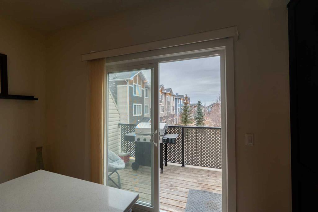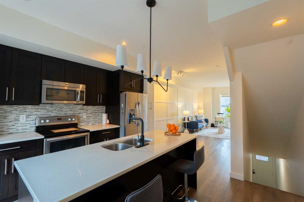 The kitchen is both elegant and functional, featuring rich dark wood cabinetry that contrasts beautifully with crisp white quartz countertops and a central island. Stainless steel appliances complete the modern look, while sliding patio doors open onto a spacious balcony — perfect for morning coffee, evening BBQs, or gathering with family and friends.