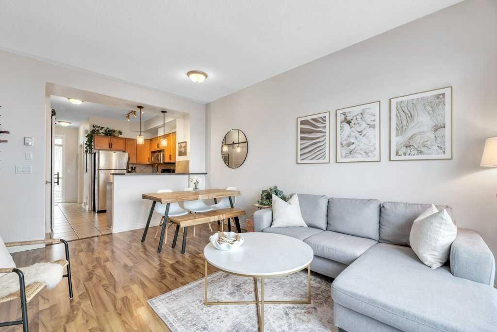 The main floor features 9’ ceilings, laminate and tile flooring, stainless steel appliances, and spindle railings. The kitchen offers a pantry and breakfast bar, opening into a bright dining and living area with direct access to a sunny, south-facing patio with mountain views and a gas line for BBQ.