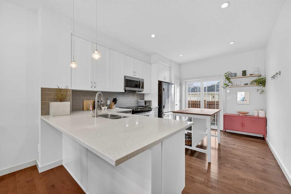 The sunny west-facing front porch sets the tone and is perfect for evening relaxation. Inside, the open-concept main floor is filled with natural light and showcases hardwood flooring, high ceilings, and a spacious living area that flows seamlessly into the kitchen and dining space. The kitchen features quartz countertops, stainless steel appliances, ample cabinetry, and direct access to the private rear patio and fenced yard, ideal for BBQs and low-maintenance outdoor living.