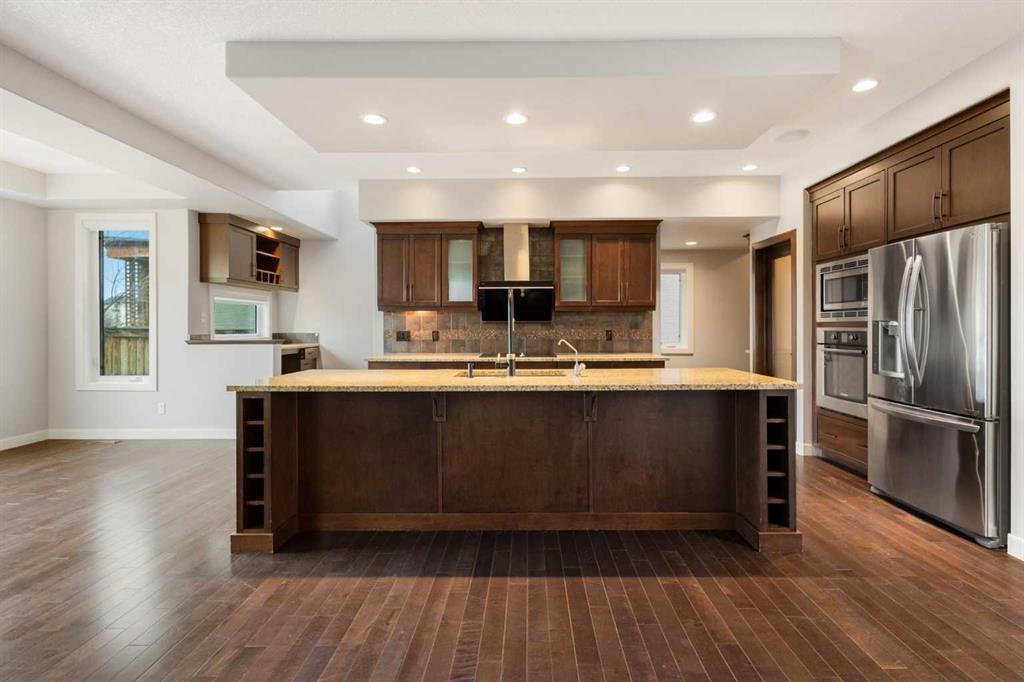 The main floor features a functional layout with separate living and family rooms divided by a fireplace, creating distinct spaces for daily living, hosting guests, or quiet family time. Rich hardwood flooring adds warmth and elegance throughout the main level, while upgraded lighting enhances the home’s bright and refined feel. The kitchen is both stylish and practical, featuring rich dark wood cabinetry, light-toned quartz countertops, stainless steel appliances, and a generous central island with excellent prep space, storage, and casual seating potential. The warm, classic colour palette gives the home a timeless feel, while the layout connects well with the dining and family areas for everyday use and entertaining.
