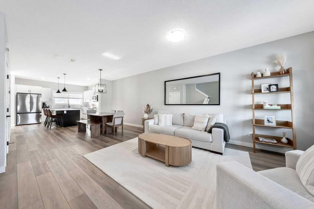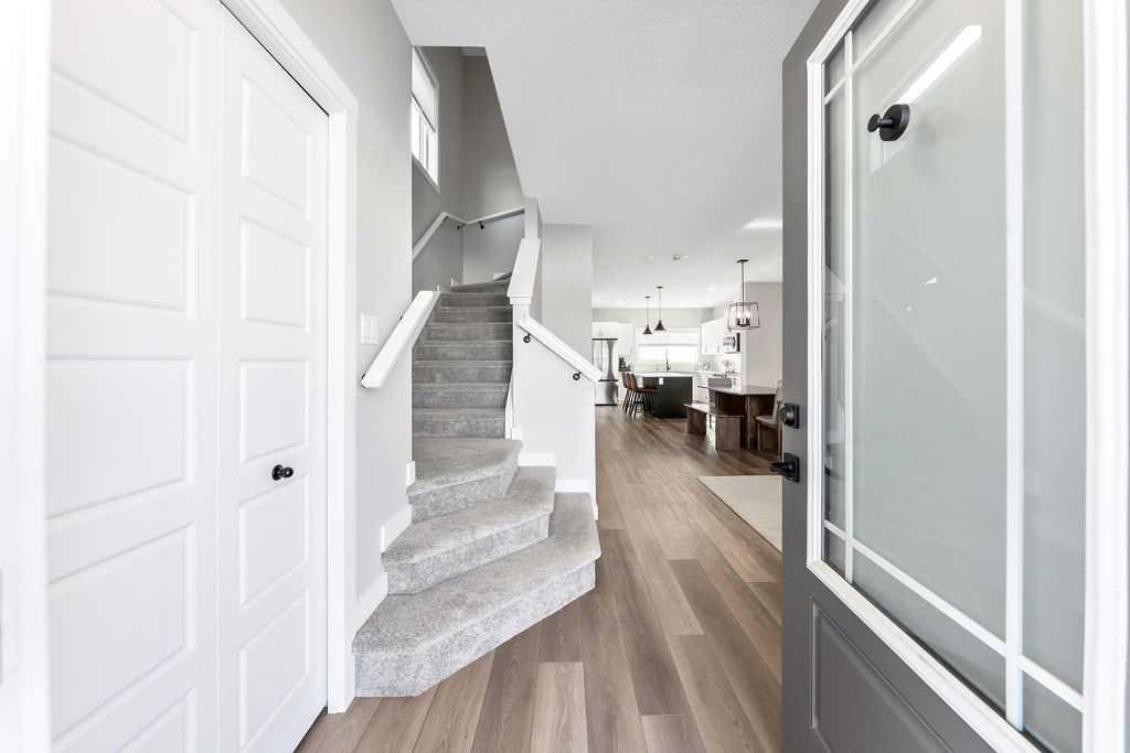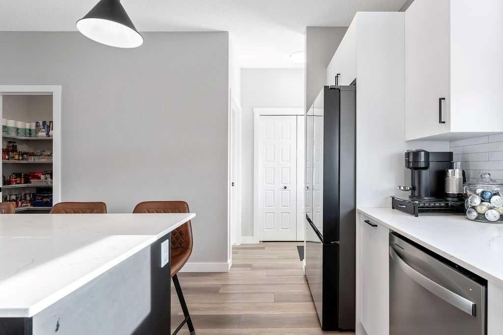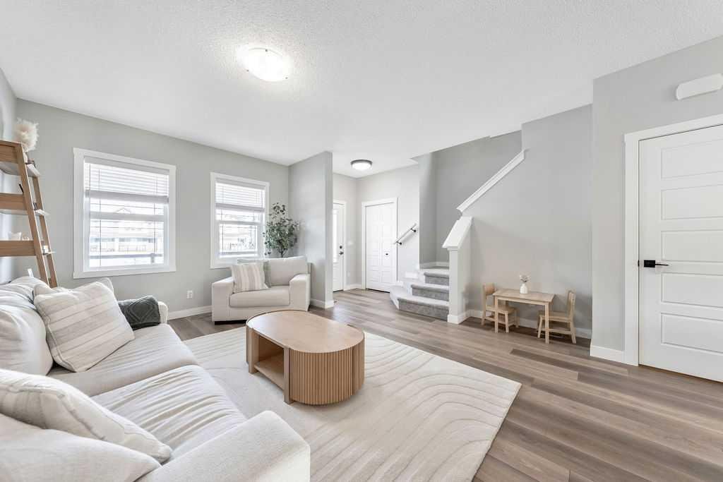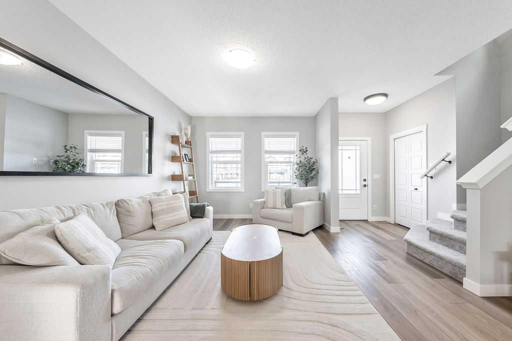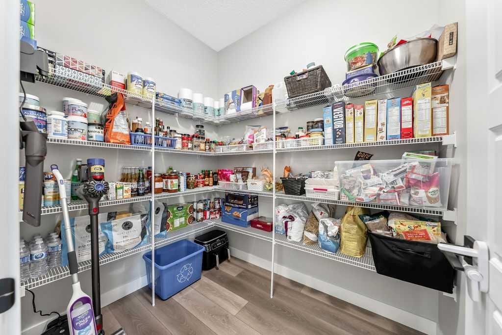 Step inside to a bright, open-concept main floor featuring a spacious living room perfect for cozy nights or entertaining friends. The chef-inspired kitchen is a true showpiece with quartz countertops, slow-close cabinetry, a large central island, stainless steel appliances, upgraded sink and faucet, and a massive walk-in pantry. Natural light fills the space through the kitchen window, and LED lighting throughout adds a modern, polished touch. A convenient powder room completes the main floor.