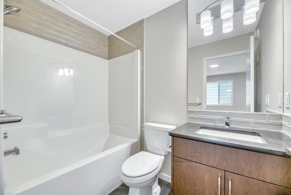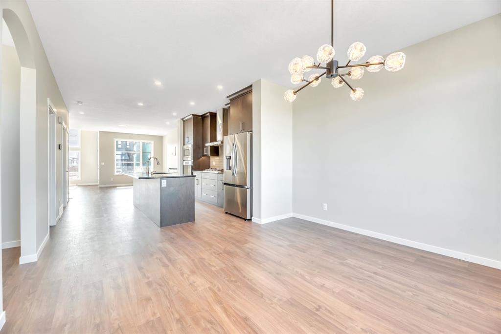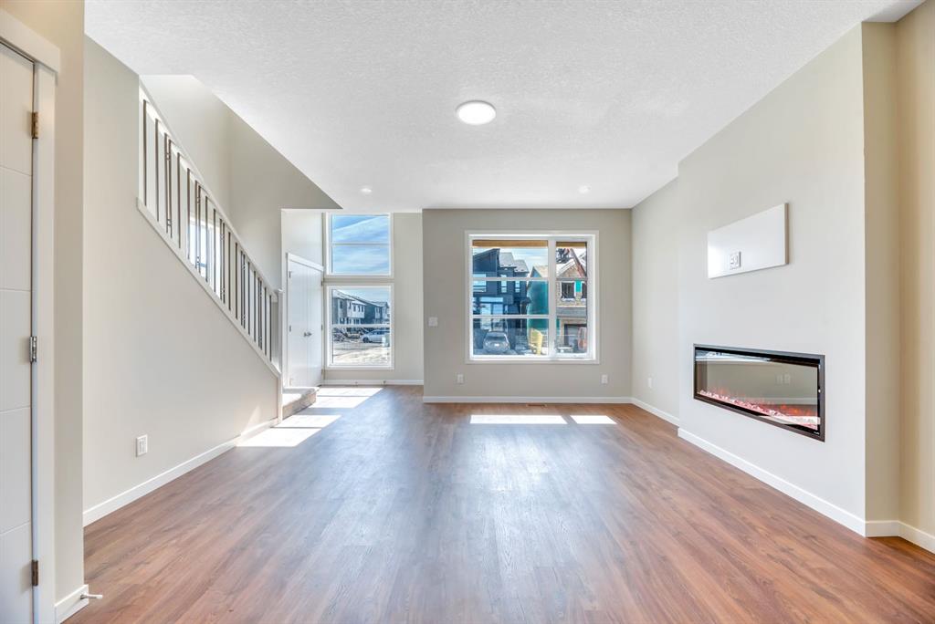 Step inside to a bright, open-concept main floor where walnut-toned luxury vinyl plank flooring flows seamlessly throughout. The spacious great room is anchored by a sleek electric fireplace, creating a warm and inviting atmosphere. At the heart of the home, the stunning central kitchen is designed to impress with a large island, upgraded quartz countertops, tile backsplash, flat-panel wood grain cabinetry, and premium appliance package including a 5-burner gas cooktop, built-in wall oven, and microwave. Thoughtful upgrades such as under-cabinet lighting, pots and pan drawers, and garburator enhance both style and functionality.