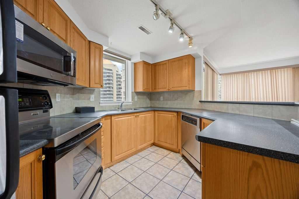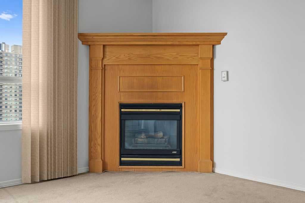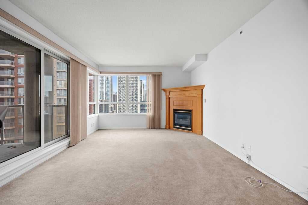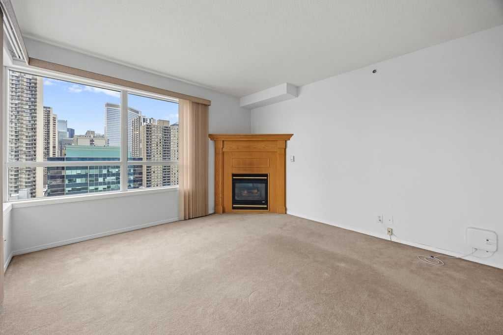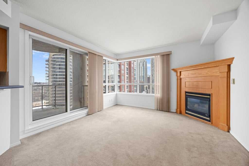 The open-concept layout is bright and inviting, with large windows that draw in natural light and showcase dynamic city views. A gas fireplace adds warmth and character to the living space, while the kitchen is equipped with stainless steel appliances and a stylish breakfast bar—perfect for morning coffee or relaxed meals at home.
