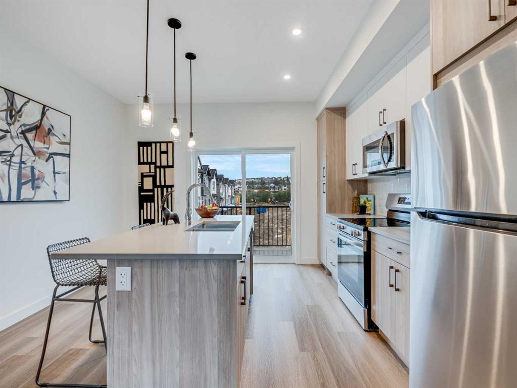 Step into a life of style and ease with this gorgeous, three-story townhome nestled in the highly sought-after Westmount, Okotoks community. Built by the trusted team at Slokker Homes, this property is your launchpad for modern living in a prime, family-friendly location. The bright, open-concept main floor is designed for seamless entertaining. You’ll love the airy feel created by soaring knockdown ceilings and the flow of the durable vinyl plank flooring. The kitchen is a true showstopper: Quartz counters, high-end stainless steel appliances and chic, two-tone cabinetry with soft-close drawers. Upstairs, you’ll find two generous bedrooms, including the relaxing primary suite with its own full ensuite bathroom. A well-placed laundry area on this level makes laundry a breeze. Location is everything, and this one delivers! Enjoy the security and convenience of an attached garage plus an EXTRA TITLED parking stall!. Your prime Westmount spot puts you steps from the Daily errands and weekend fun are simple with the Westmount Centre retail hub—offering essential shopping, dining, and services—just minutes away. This home beautifully blends sophistication, comfort, and unbeatable location, providing the perfect base for your vibrant life in the foothills.