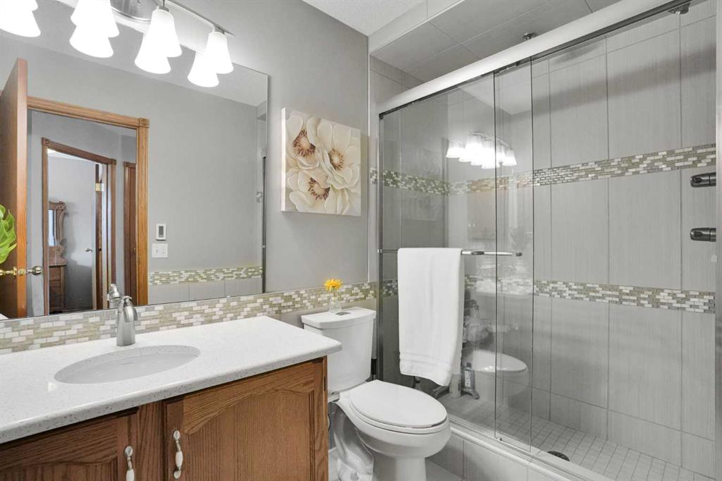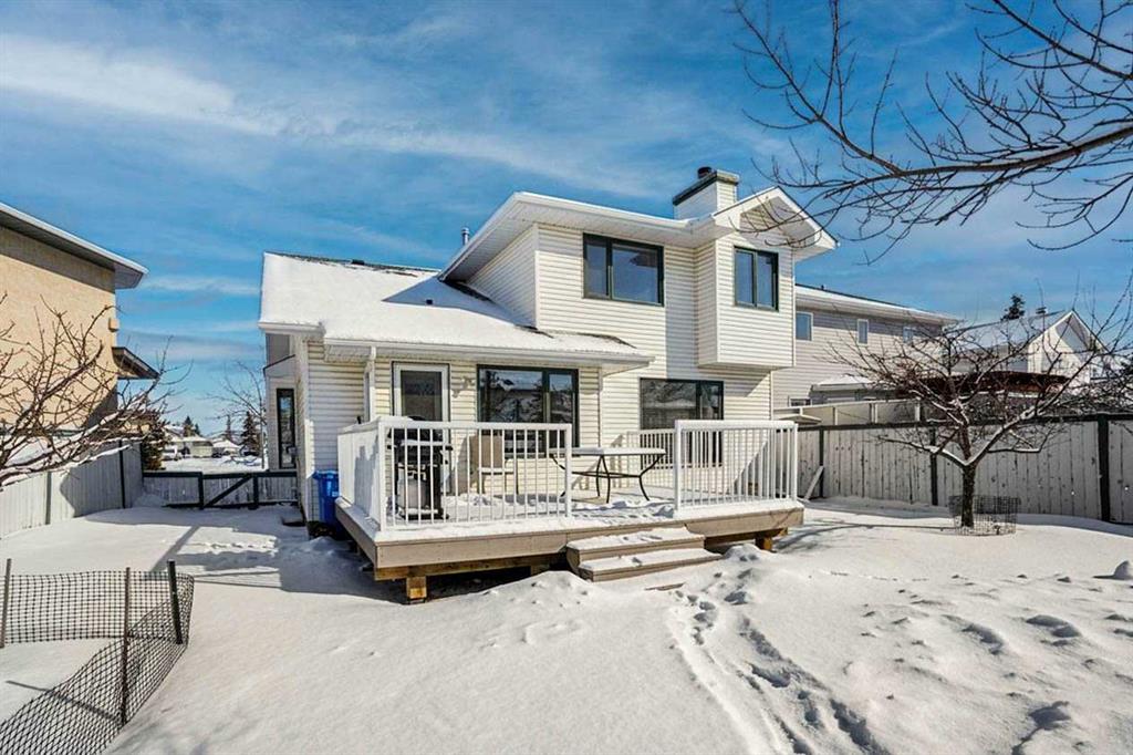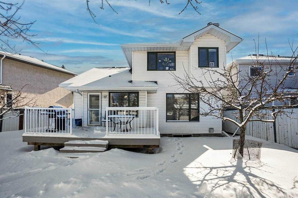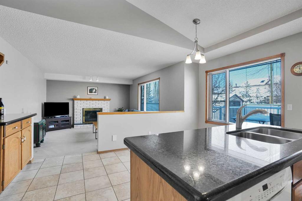 Welcome to this stunning 2-storey split with over 2800 SF of livable area in PRISTINE condition in the desirable Hawkwood community. This lovingly maintained home sits on a rare pie-shaped lot on a quiet street in the heart of the community. Step inside and be welcomed by large windows and a soaring vaulted ceiling that creates a bright and airy atmosphere. The well-appointed kitchen provides ample cabinetry, corner pantry and granite countertops. Beside the kitchen is a large living room, complete with a wood burning fireplace with gas ignition, just perfect for relaxing at the day’s end, or those memorable holiday gatherings. The main floor den creates versatility and can be used as a home office or flex space. Main floor laundry and a 2-pc bath complete this level. Upstairs, you will find two generously sized bedrooms that are serviced by a luxuriously renovated 4-pc bathroom, which features lovely tile work, heated floors and a rainhead shower! The spacious primary suite comes equipped with a walk-in closet and a 4-pc ensuite featuring a corner shower and a separate soaker tub. Downstairs, the fully developed basement has brand new carpet and a large family room, with a corner gas fireplace. Two more bedrooms can be found here as well as another 4 pc bathroom. There is also a rough-in for a wet bar if you want to take this space one level further! Outside, sit and unwind on the large composite deck with aluminum railings, and watch your garden grow! Brand new Furnace if you need to hear more! This is a unique opportunity to own a light-filled, meticulously maintained home just steps up the road from a park in one of Hawkwood’s best locations. This home is the total package!