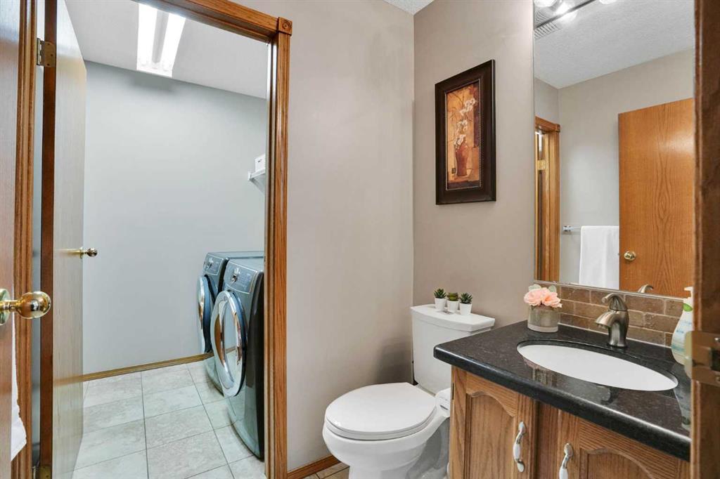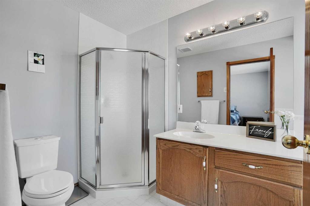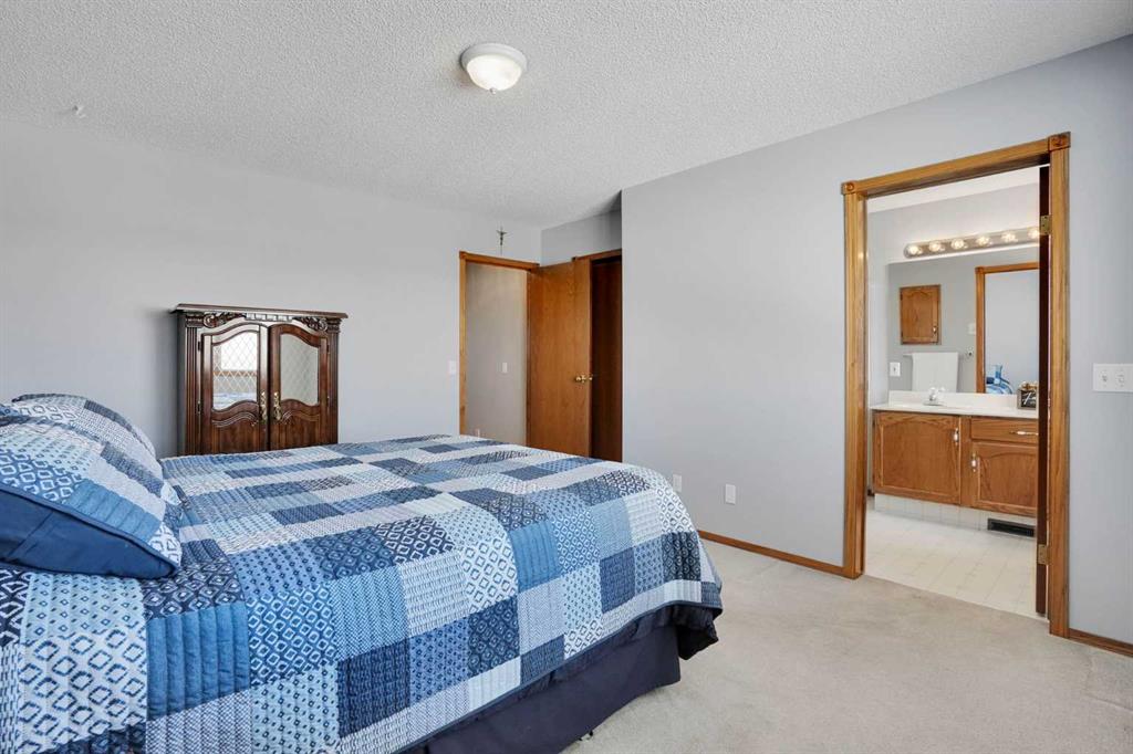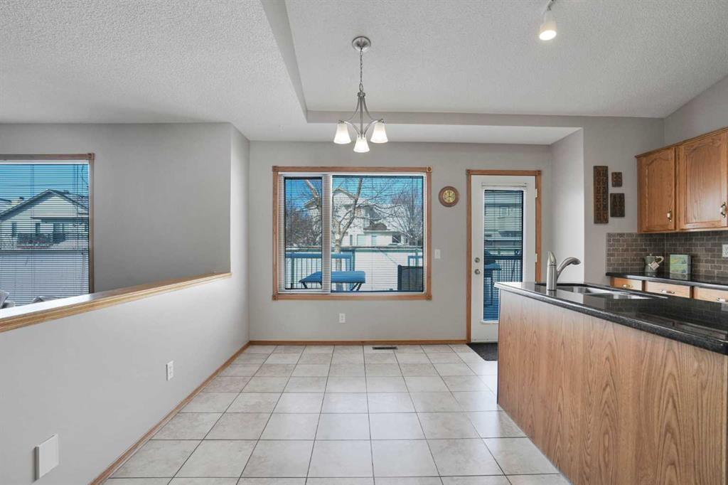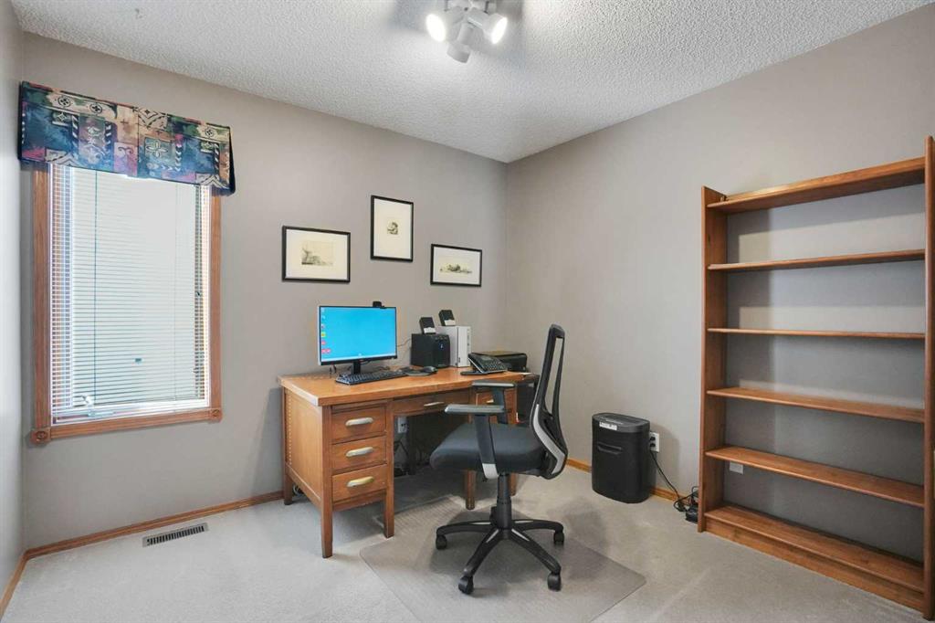 Welcome to this stunning 2-storey split with over 2800 SF of livable area in PRISTINE condition in the desirable Hawkwood community. This lovingly maintained home sits on a rare pie-shaped lot on a quiet street in the heart of the community. Step inside and be welcomed by large windows and a soaring vaulted ceiling that creates a bright and airy atmosphere. The well-appointed kitchen provides ample cabinetry, corner pantry and granite countertops. Beside the kitchen is a large living room, complete with a wood burning fireplace with gas ignition, just perfect for relaxing at the day’s end, or those memorable holiday gatherings. The main floor den creates versatility and can be used as a home office or flex space. Main floor laundry and a 2-pc bath complete this level. Upstairs, you will find two generously sized bedrooms that are serviced by a luxuriously renovated 4-pc bathroom, which features lovely tile work, heated floors and a rainhead shower! The spacious primary suite comes equipped with a walk-in closet and a 4-pc ensuite featuring a corner shower and a separate soaker tub. Downstairs, the fully developed basement has brand new carpet and a large family room, with a corner gas fireplace. Two more bedrooms can be found here as well as another 4 pc bathroom. There is also a rough-in for a wet bar if you want to take this space one level further! Outside, sit and unwind on the large composite deck with aluminum railings, and watch your garden grow! Brand new Furnace if you need to hear more! This is a unique opportunity to own a light-filled, meticulously maintained home just steps up the road from a park in one of Hawkwood’s best locations. This home is the total package!