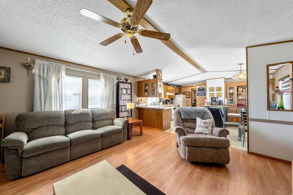 Unique opportunity to own a well-maintained 1108 square foot single-wide mobile home set on a generously sized pie-shaped lot. Built in 1992, this home offers functionality along with an additional 8 x 12 ft attached storage space that is perfect for seasonal items, tools, or extra storage needs. The cozy interior features an open-concept layout with vaulted ceilings that create a bright, spacious and welcoming atmosphere throughout the main living area. You’ll also appreciate the abundance of cabinetry and generous counter space, ideal fo everyday living and entertaining. The thoughtful layout includes three bedrooms and two full bathrooms, both generously sized to accommodate families, guests, or a home office setup. Additional value is found in key updates, including a roof approximately 8 years old and a furnace approximately 9 years, both offering peace of mind for years to come. This home also comes with several added inclusions such as a deck box, entertainment center, and a window A/C unit, making it move-in ready with added convenience. Enjoy living right in the heart of Okotoks, just steps from parks, pathways, historic downtown, the recreation centre, and shopping. Lot fees of $1,277/month include water, sewer, garbage, compost, recycling, and snow removal. Buyer approval is required by Cove Communities (see member remarks for additional details). Don’t miss this rare opportunity to enjoy open concept living, tons of storage, and the quaint lifestyle of Okotoks.