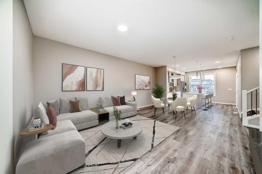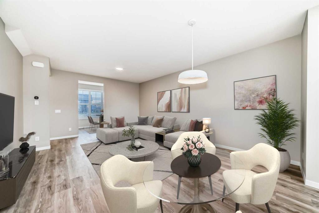 Meet the brand-new “Heath,” a fresh take on a beloved layout that blends smart design with everyday comfort. Step inside to a bright, open main floor finished in warm luxury vinyl plank, with a versatile front flex room that suits a home office, homework zone, or cozy reading spot. The rear of the home opens to an inviting living room and an oversized dining area—perfect for weeknight dinners and weekend gatherings alike. Anchoring the space, the chef’s kitchen showcases wood-grain cabinetry raised to the bulkhead, crisp white quartz counters, a classic subway tile backsplash that wraps the standalone hood fan, stainless steel appliances, and a large island that makes prep, snacks, and conversation effortless. A generous back window brings in natural light, and the practical rear entrance keeps daily comings and goings simple. Upstairs, a centrally located loft creates a true second living space and smart separation between the sleeping quarters. The spacious primary retreat features a walk-in closet and a spa-inspired 4-piece ensuite with dual sinks, while two additional bedrooms share a well-appointed 4-piece bath. The upper laundry room keeps chores convenient and out of sight. A side/secondary entrance adds flexibility for future possibilities such as a guest, in-law, or private living area (subject to city/municipal approvals and permitting). Outside, the landscaping is complete—front and back—so you can enjoy the space from day one. Expect finished sod, mulched side yards, and thoughtfully selected trees/shrubs in the front that complement the streetscape and elevate curb appeal. And the setting? You’re in Mahogany—Calgary’s four-season lake community—where life revolves around water, parks, and connection. Enjoy two residents-only beaches, the Beach Club, tennis and sport courts, winter skating, fishing, playgrounds, and more than 22 km of pathways and preserved wetlands. Stroll to the Village Market for cafés, restaurants, fitness, and daily essentials, with the South Health Campus and Seton Urban District just minutes away. From paddleboards to sunset walks, the Heath puts a resort-style lifestyle within easy reach.