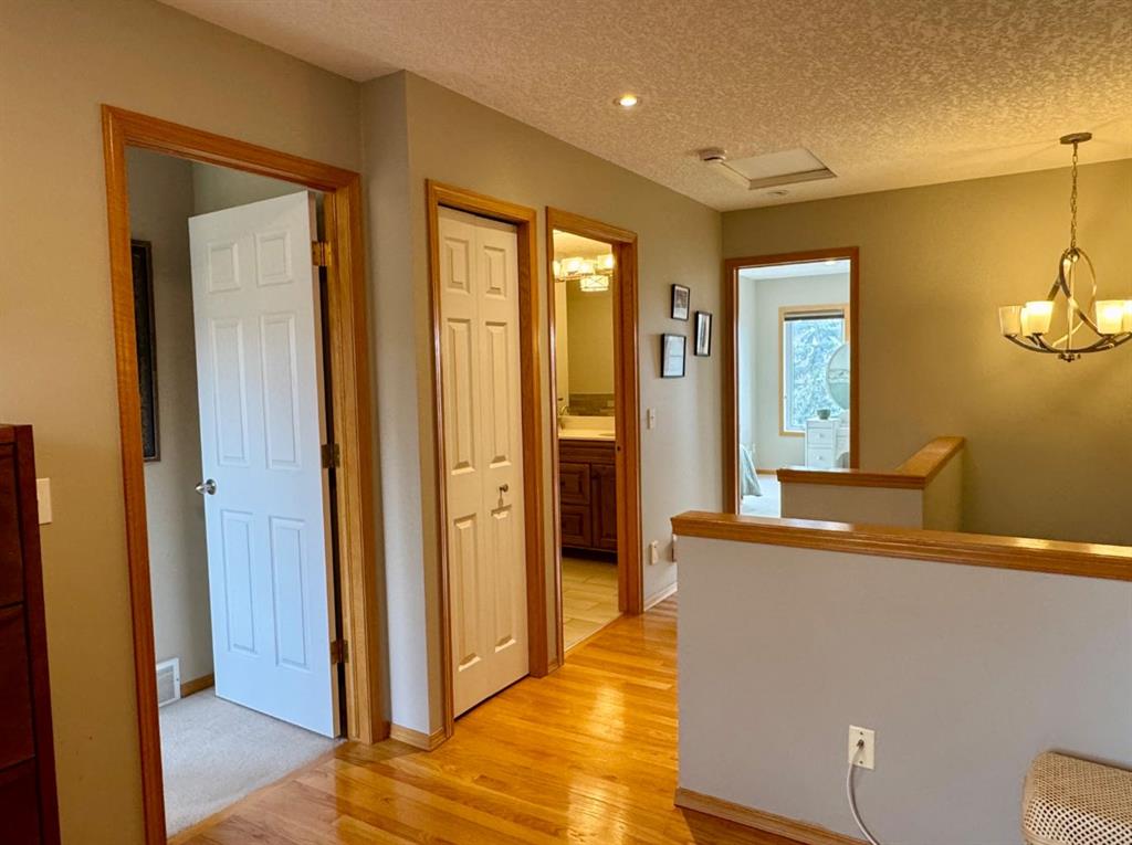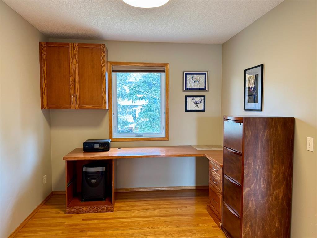 The upper level maintains a sense of cohesive design, with hardwood flooring extending through the hallway and into a dedicated den area complete with a customized built-in desk. The primary suite presents a bright and versatile space, easily accommodating a king-sized bed and featuring a charming turret-style alcove and an impressively sized walk-in closet. The secondary bedroom offers a flexible solution for guests with its integrated Murphy bed, while the five-piece main bathroom offers a spa-like experience with a walk-in shower and a deep soaker tub. Adding to the home’s practical appeal, the lower-level entry leads from a spacious tandem garage, providing secure parking and extensive storage