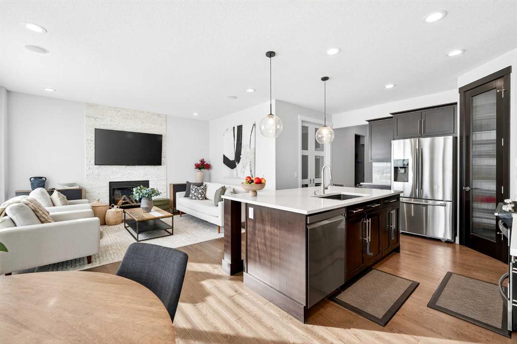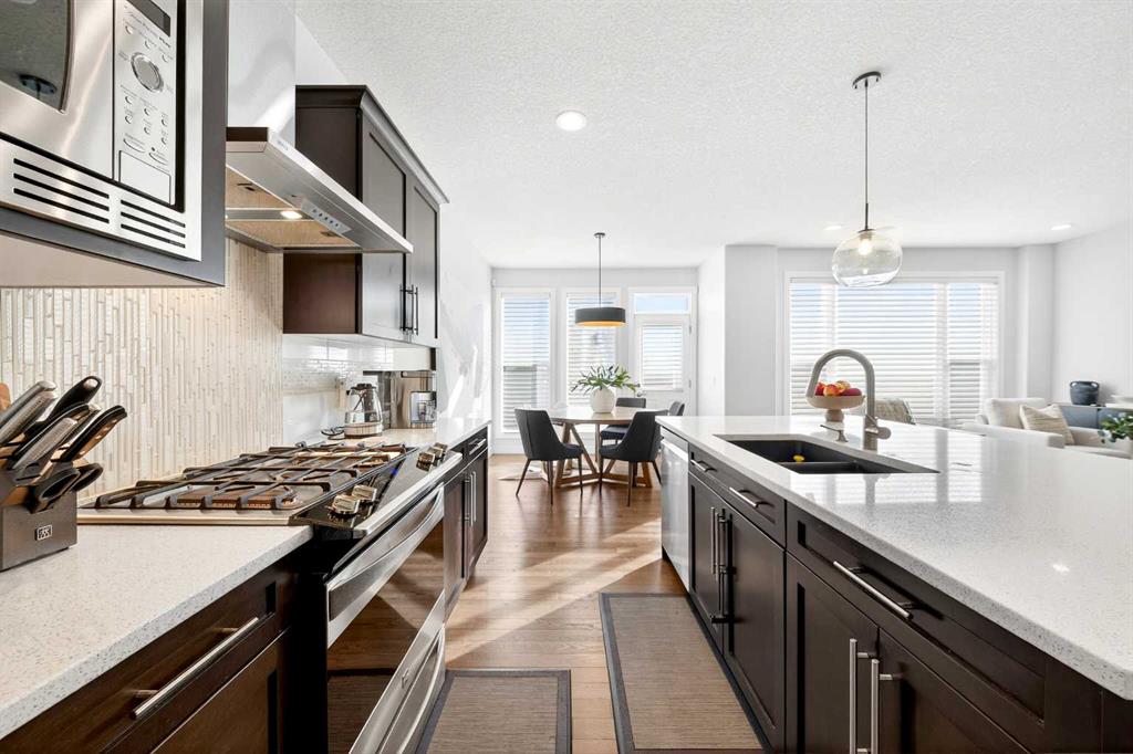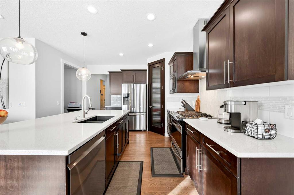 A grand 2-storey foyer with large ceramic tile flooring welcomes you, leading to 9-ft ceilings and rich hardwood flooring throughout the main level. At the heart of the home, the gourmet Kitchen features a central island, quartz countertops, stainless steel appliances including a gas stove and chimney hood fan, and a pantry. The east-facing Living room is bright and inviting, anchored by a gas fireplace with a beautiful stone accent wall, while oversized windows with custom sheer shades fill the space with natural light without compromising privacy. The Dining room opens to a full-width deck with gas hookup, with stairs descending to the expansive East-facing backyard. This level also includes a well-sized Den with French sliding doors, a mudroom with built-in cabinets and bench, and a powder room. 9 foot ceiling and 8 foot doors on the Main floor to give you the open and airy feel. Enjoy central air conditioning for year-round comfort in every room of the home.