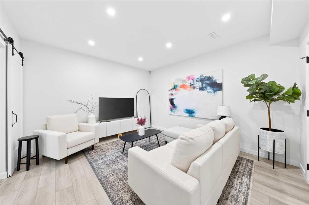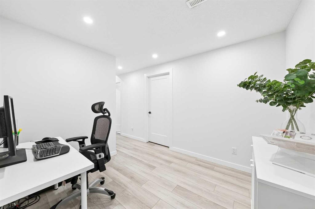 The fully finished basement features a spacious Recreation room, an open Den, and a Bedroom. An office with double barn doors and a window offers potential as a fourth bedroom, and the level also includes a full bath for convenience. Step outside to the fully fenced and landscaped massive East-facing pie-shaped lot, with a staircase leading back up to the deck, perfect for entertaining or relaxing.