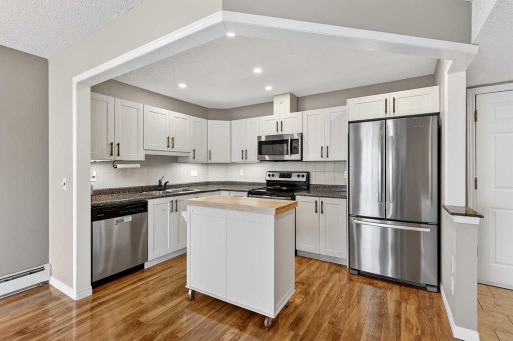 This bright 2-bedroom, 2-bathroom home includes a spacious primary suite with ensuite, updated flooring, fresh paint, and a functional kitchen with modern stainless steel appliances. The open-concept living area leads to your private balcony where you can take in stunning west-facing mountain, pond, and city views—a truly special feature.