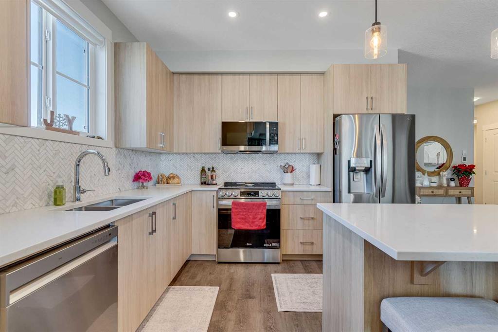 From the moment you walk in, you’ll love the 9 ft. ceilings, abundant natural light, and the thoughtful open-concept design that makes this home feel both spacious and welcoming. The kitchen is a true standout with quartz countertops, sleek cabinetry, stainless steel appliances, and plenty of prep space—perfect for everyday cooking or entertaining.