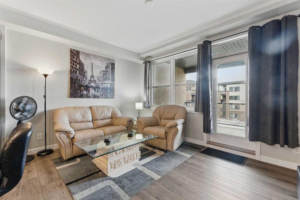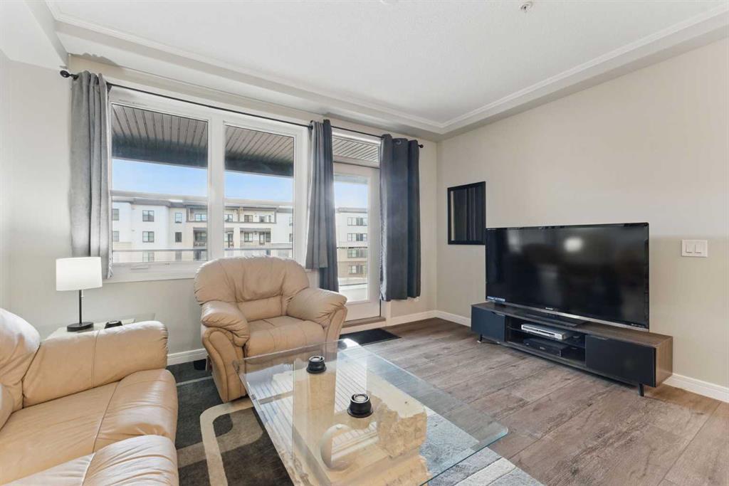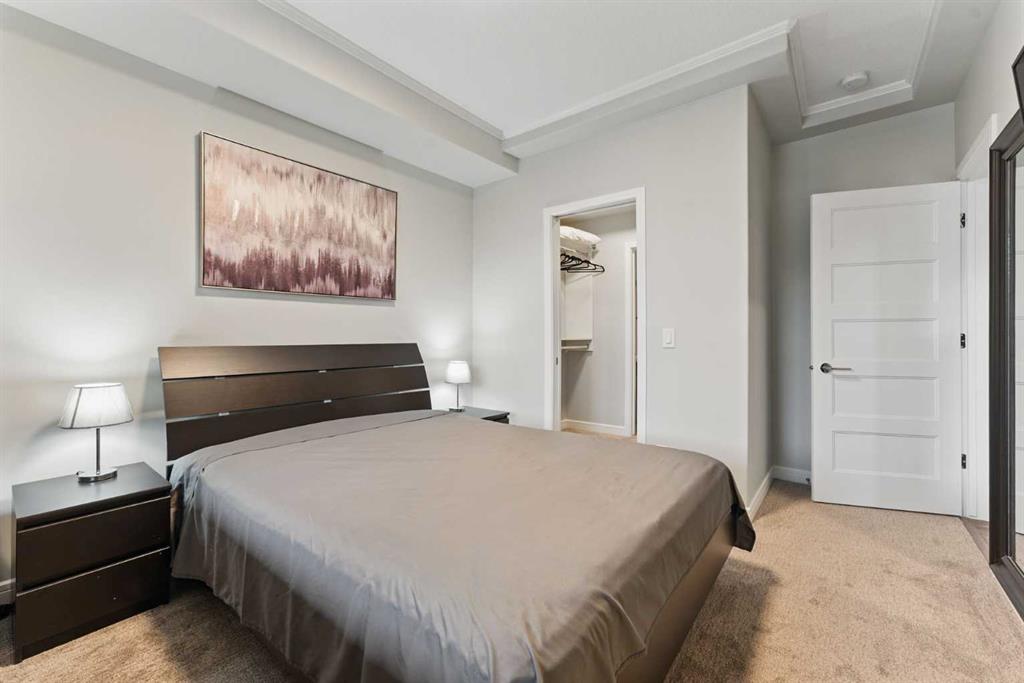 Inside, you’ll find an open-concept layout with high ceilings, vinyl plank flooring, and large windows that fill the space with natural light. The kitchen is a showstopper, featuring sleek quartz countertops, a kitchen island with breakfast bar seating, stainless steel appliances, and ample storage with built-in features and crown molding. The spacious living and dining area offers the perfect setting for relaxing or entertaining, while the private west-facing balcony—with a BBQ gas line and courtyard views—extends your living space outdoors.
