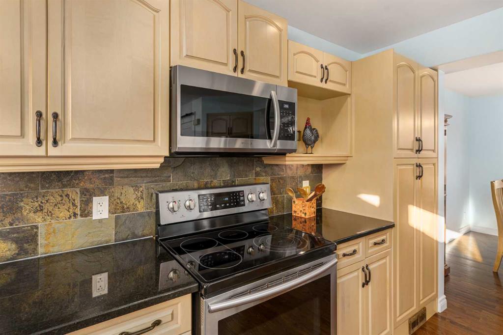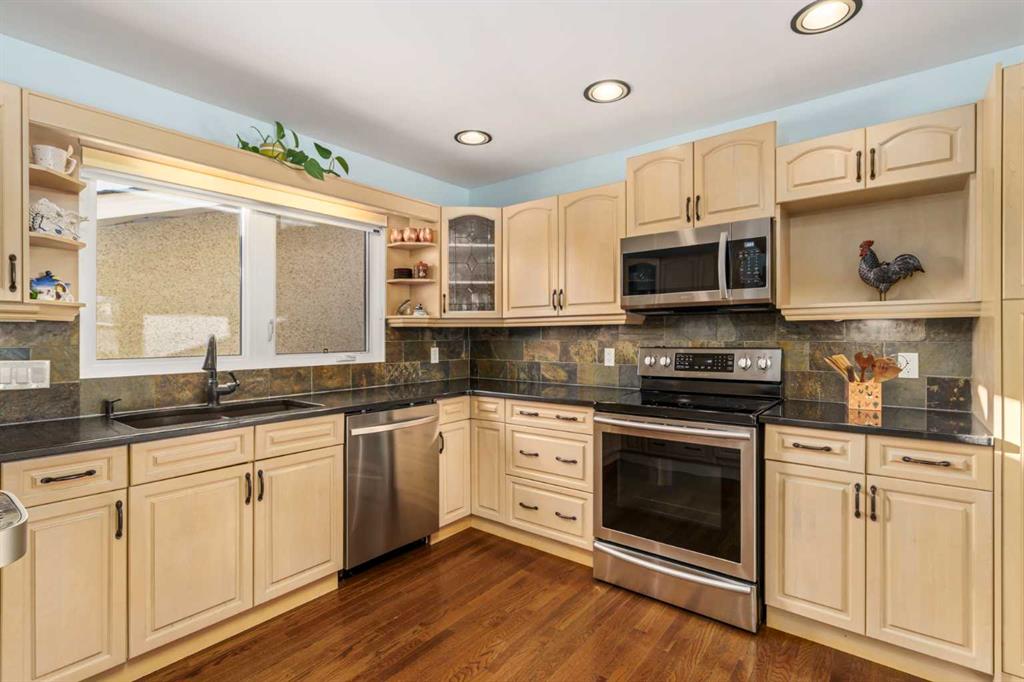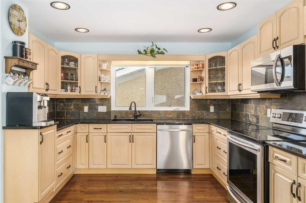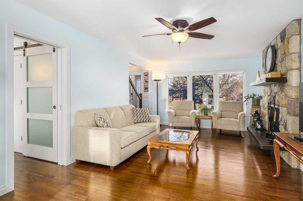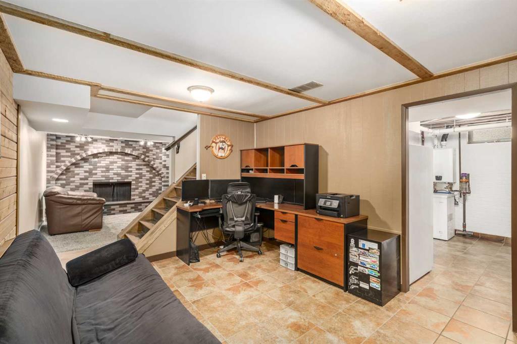 A thoughtfully, well-designed two-storey home with numerous improvements and upgrades is now available in the very desirable SE community of Bonavista Downs. This is a unique home in that it features two garages. The first is a front-facing, single (21’x12’), attached, insulated and heated garage with upgraded wiring, and finished interior which includes shelving. The front rubber-paved driveway offers additional parking. The second is an oversized double (25’ x 28’), heated, detached garage accessed from the paved alley, and has a finished interior which includes shelving, cabinets, and a workbench and is wired for 220 volts. Three bedrooms, 3.5 baths and 2,250 sq. ft. of living space on three levels. Upon entering the tiled foyer, the natural light flowing in from the upgraded triple pane windows on all sides is remarkable. Motorized window blinds allow you to control the light factor. The main floor is comprised of living room, dining room and kitchen and has warm hard wood floors throughout. To the left is the living room with woodburning, stone surround fireplace and enough space to experiment with various furniture configurations. The rear deck is accessed via French doors in the living room. To the right of the foyer is the dining room with ample room for entertainment and is adjacent to the kitchen. Cream cabinetry and plenty of it in the kitchen is a beautiful contrast to the dark granite countertops and tiled backsplash. Gleaming stainless appliances and a pantry add to the efficiency. A 2-pc. bath completes the main level. Moving upstairs, there is a combination of hardwood and laminate flooring. The primary bedroom is large and sunny with the benefit of a newly added walk-through closet and 4-pc. ensuite (double vanity). Two additional bedrooms, both with generous-sized closets, share a 4-pc. bath. The basement has been attractively finished and features a large, carpeted rec room with a second woodburning fireplace (both fireplaces passed WETT inspection in 2023). Across from the rec room is a tiled home office and tucked back of that is the laundry room with upgraded plumbing, venting and wiring; storage area and an upgraded 3-pc. bath. The house, attached garage and detached garage all have well-insulated (R40) attics. In 2023 the furnace was upgraded to a high-efficiency model with smart thermostat, a tankless water heater was installed and the humidifier was replaced. Both front and back yards are landscaped with lawn and mature trees. The back yard is fenced and has sprinklers installed. A bonus is your own hot tub. Well situated and close to Stoney, Deerfoot and Macleod Trails and Anderson Road. Proximity to shops and restaurants on both Macleod Trail and 130th Avenue; the Bow River; numerous schools (public and Catholic); churches; playgrounds; dog parks; Fish Creek Provincial Park and South Health Campus. This home has obviously been well tended as evidenced by the many upgrades and enhancements. Don’t miss out on this outstanding opportunity.