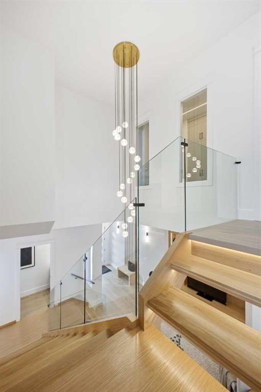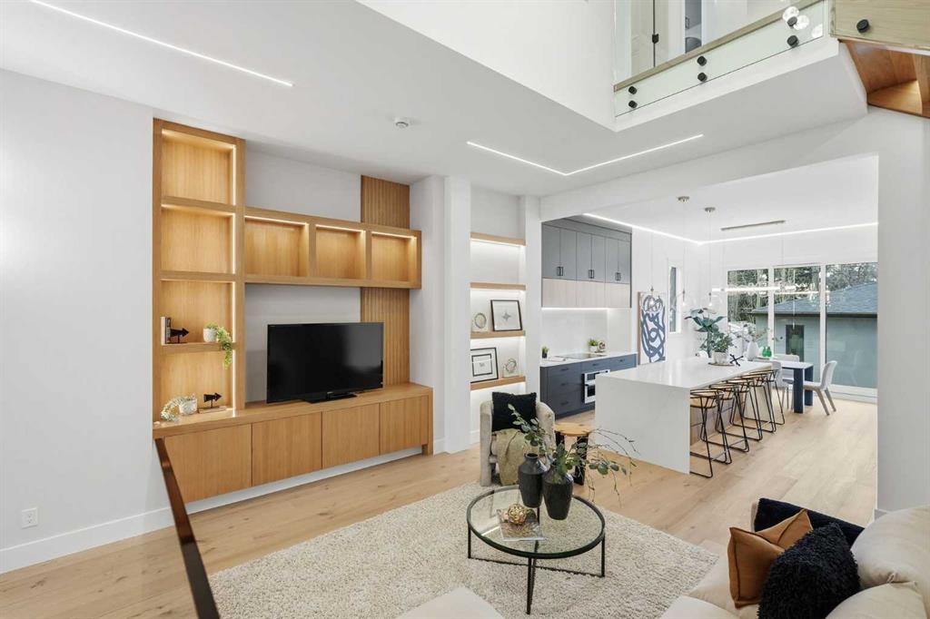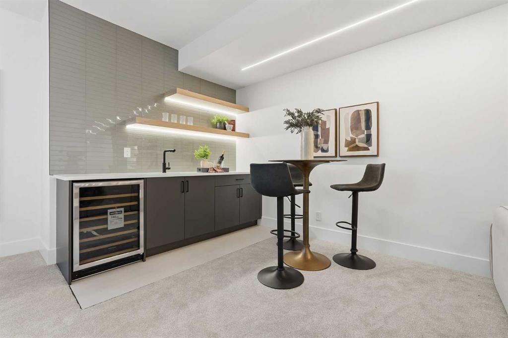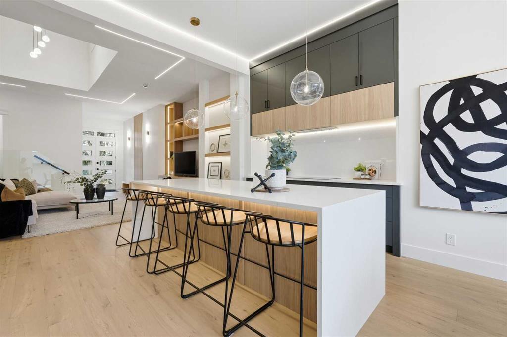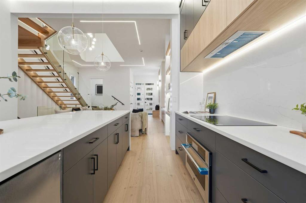 Stunning new home with full Smart Home capability, built by Libra Homes situated on a 27.6’x120’ lot in the heart of North Glenmore Park, offering 3+1 bedrooms & over 3000 sq ft of luxurious living space. The open & airy main level presents wide plank hardwood floors, lofty ceilings & stylish light fixtures, showcasing a spacious living room with built-ins that seamlessly transitions into the unique dual style kitchen that’s perfect for the entertainer & tastefully finished with quartz counter tops, island/eating bar & the convenience of a built-in oven, gas stove with pot filler, rangehood, full sized fridge & a second smaller built-in paneled fridge with 2 drawers, making prep work & cooking for large gatherings effortless. A bright dining area provides ample space to host family & friends. A private office is located just off the foyer, perfect for a home office setup & a 2 piece powder room completes the main level. Ascend the open riser staircase to the second level that hosts 3 bedrooms, a 5 piece main bath & a well-designed laundry room with sink & storage. The primary retreat boasts a to-die-for walk-in closet & opulent 5 piece ensuite with dual sinks, relaxing freestanding soaker tub & oversized glass enclosed shower. Basement development lends itself to game or movie night, featuring a family/media room with built-in entertainment centre, cozy fireplace, built-in speakers & wet bar with plenty of room for a second seating area. A fourth bedroom & 3 piece bath are the finishing touches to the basement. Other notable features, roughed-in A/C, LED lighting throughout, large back deck & double detached garage with enough space to park a larger vehicle. The location is incredibly convenient, close to Glenmore Athletic Park, Lakeview & Earl Grey Golf Clubs, schools, shopping, public transit & effortless access to Glenmore & Crowchild Trails.