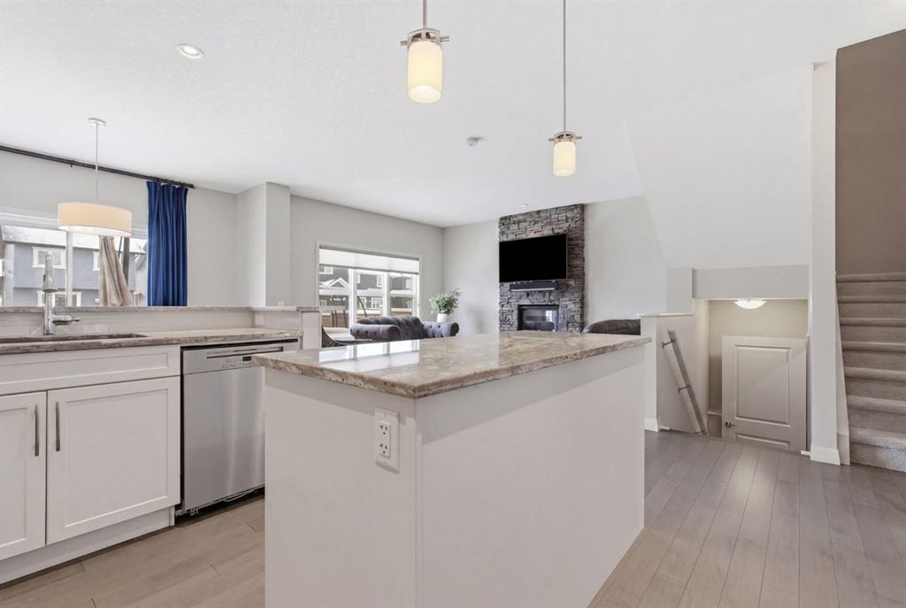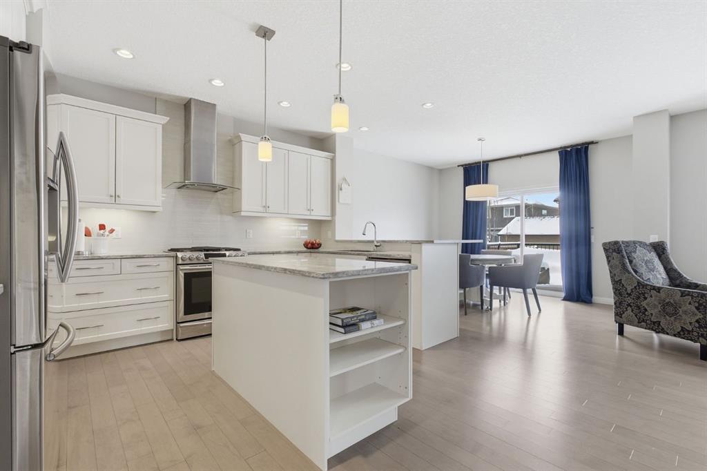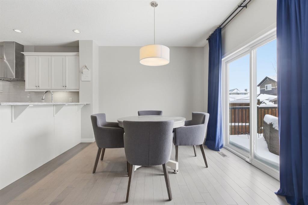 Step inside to a bright and inviting main floor where large windows fill the space with natural light. The open-concept layout is anchored by a stunning white kitchen featuring quartz-style counters, stainless steel appliances, a large central island, pantry, and plenty of cabinetry. Whether hosting friends or managing busy mornings, this kitchen was designed to be both beautiful and practical. The adjacent dining area opens onto the spacious 16′ x 13′ east-facing rear deck, the perfect place to enjoy your morning coffee while taking in the sunrise. A spacious living room, 2-piece powder room, and welcoming front entry complete the main level.