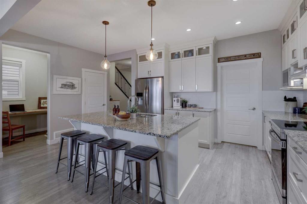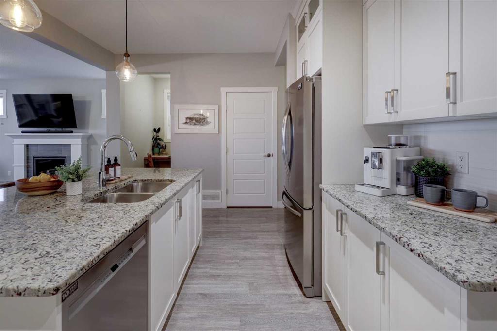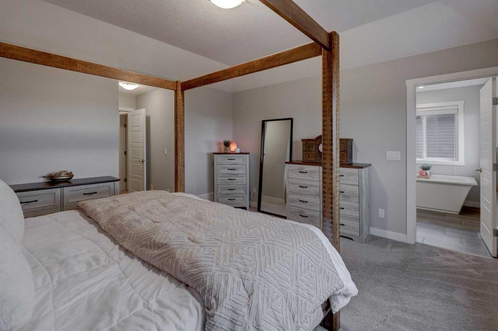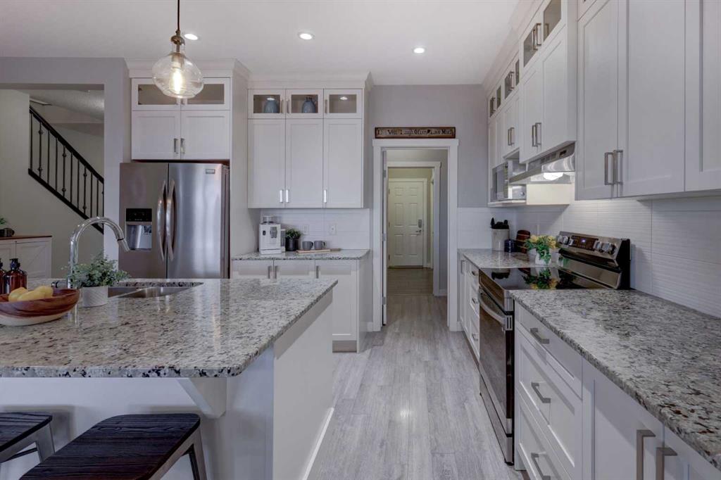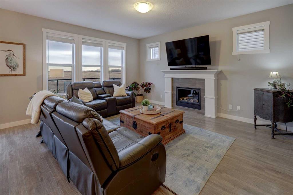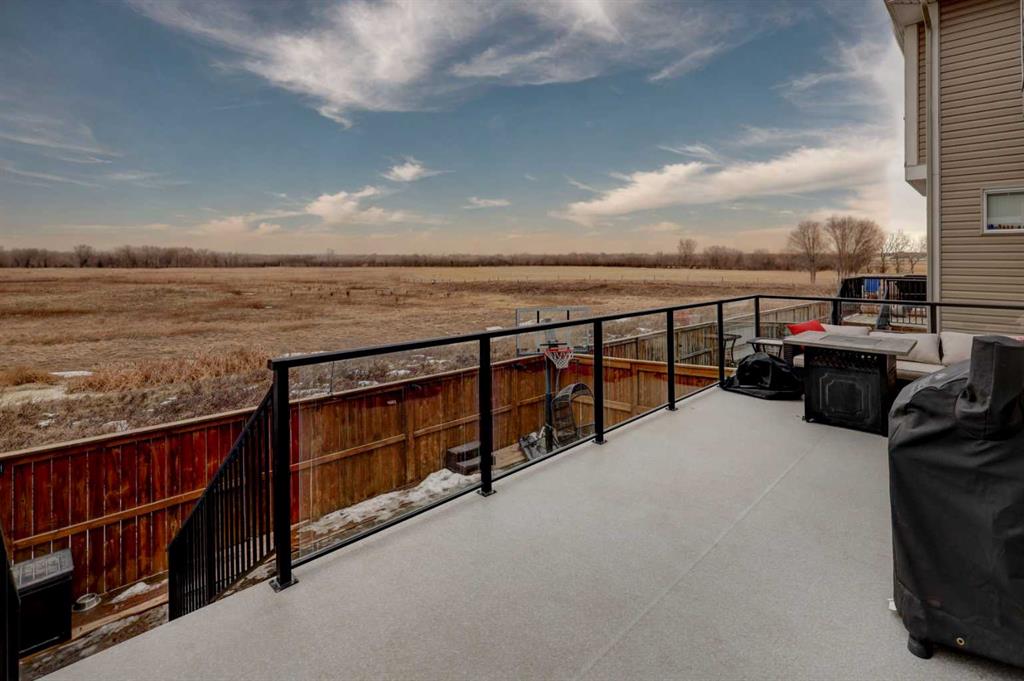 Stunning 4-Bedroom home with ALL the bells and whistles, backing onto a serene environmental reserve and creek, on a quiet street in Williamstown. From the moment you arrive, you’ll appreciate the low-maintenance front driveway and gravel yard accented with mature tree, plus the convenience of a double attached oversized garage. Step inside to an open foyer featuring durable laminate flooring, 9′ ceilings, and an organized front closet with built-in storage for coats and shoes. The heart of the home is the grand and elegant Kitchen, showcasing floor-to-ceiling white cabinetry with glass upper display cabinets, granite countertops, tiled backsplash, SS appliances, and a large eat-up island with sink—perfect for gathering and entertaining. A highly desirable double walk-through Pantry with built-in shelving connects seamlessly to the Mudroom, which is complete with built-in storage, a bench, and hooks. The main floor also features recessed lighting, and expansive windows that flood the space with natural light. The spacious Dining area easily accommodates a large table, while the inviting Living Room is anchored by a cozy gas fireplace with mantel. Step outside from the Dining Room onto the large back deck with glass railings, offering unobstructed views of the north-facing creek and nature reserve with NO neighbors behind for total privacy. Completing the main level is a charming Office Nook with its own window and a 2-pc bathroom with a pedestal sink. Up the elegant spindled stairs, you’ll find a massive Bonus Room with vaulted ceilings, perfect for movie nights or a kids’ retreat. The inviting Primary bedroom features a tray ceiling, an oversized window with a bench seat, breathtaking views and a massive walk-in closet! The luxurious 5-pc ensuite offers a standalone soaker tub beneath a window, dual vanities with granite countertops, and an oversized tiled walk-in shower. THREE additional bedrooms—each with their own closet—share an easily accessible 5-pc bathroom with dual vanities, granite counters, and ample storage. Finishing off the upper level is the convenient Laundry Room with tiled floors, shelving, and a linen closet. Downstairs hosts a partially finished basement, ready for your finishing touches. It already features Family room/Gym area, Rec Room space, and an abundance of storage. You can stay cool with the central air conditioning or enjoy the fabulous outdoor space this home offers. The fully fenced backyard comes with a stamped concrete pad, under-deck storage, and low-maintenance landscaping—the perfect place to soak in sunshine and serene views. Even the location is 10/10—ideally located close to schools, parks, walking paths, shopping, and amenities, with easy access for commuting. This home offers the perfect blend of space, style, and setting in one of Airdrie’s most family-friendly communities. Book your private viewing TODAY!