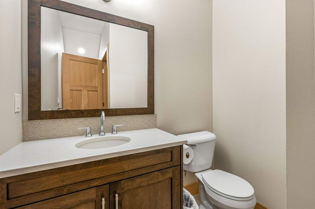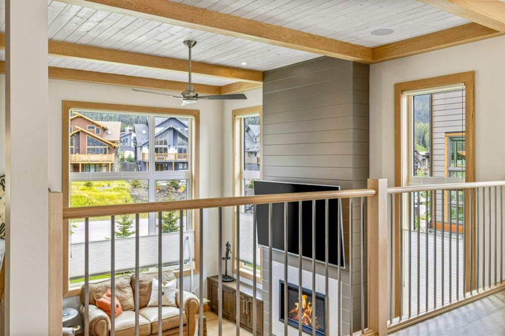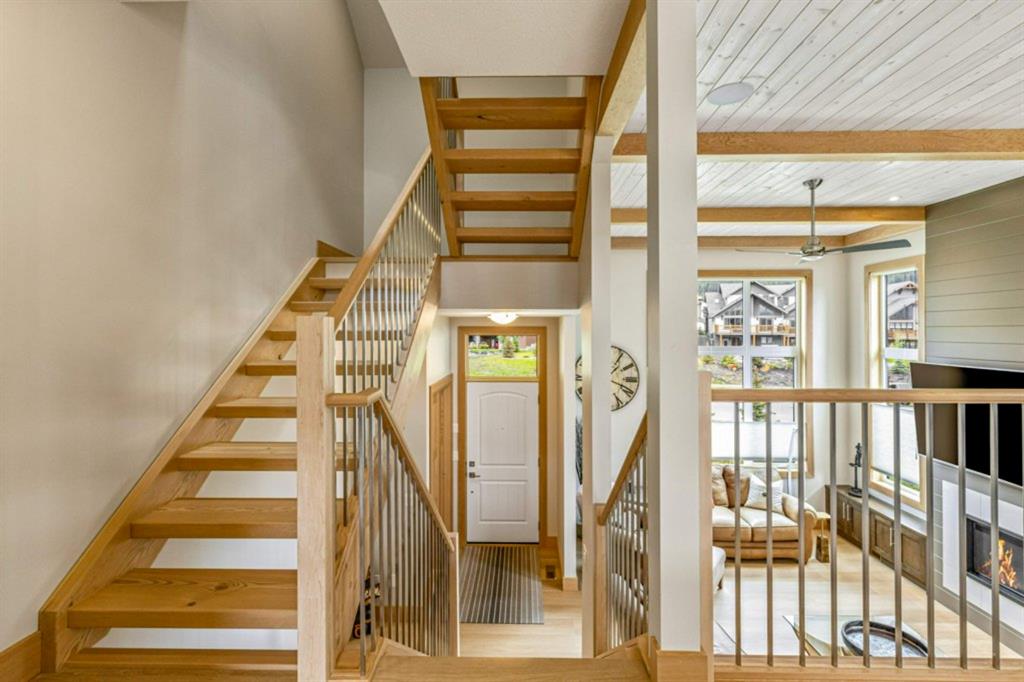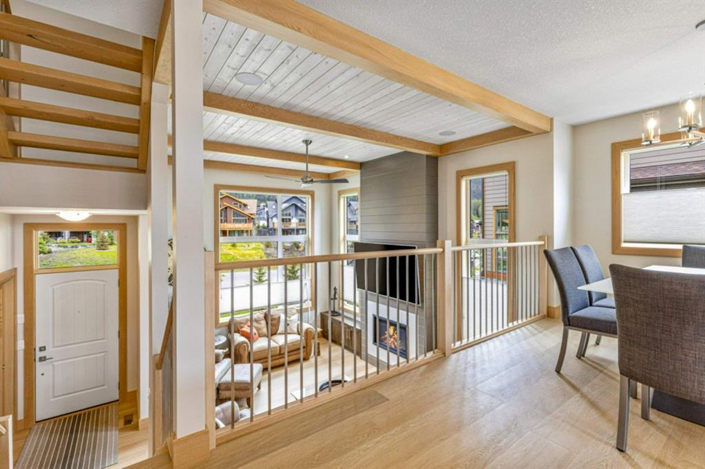 Adjacent to the renowned Stewart Creek Golf Course, this remarkably upgraded mountain-modern home captures the essence of Canmore living. Vaulted ceilings, expansive windows, and 180° exposure flood the 1,850SF space with natural light while framing breathtaking mountain views. Thoughtful design details run throughout, including a custom wood ceiling, stained cabinetry, open-riser stairs, and striking wood beams. The chef’s kitchen showcases premium built in appliances (including a 6 burner gas cooktop), large quartz island, and direct access to a massive west-facing wraparound deck with a BBQ gas hookup—perfect for morning coffee or evening sunsets. From the kitchen, look out over the inviting family room, where a statement gas fireplace anchors the south-facing living space. Upstairs, the serene primary suite features a picture-frame window with views of the iconic Third Sister, a private ensuite with double sinks, and a generous walk-in closet. Two additional bedrooms and a 4-piece bath complete the upper level. The versatile lower level includes a fourth bedroom or flex space ideal for a media room, home office, or fitness area, along with a third full bath. The heated double garage offers epoxy flooring, a slatted wall organizing system, and ample gear storage—perfect for outdoor enthusiasts. Additional upgrades include hardwired speakers, a hot tub rough-in, EV charging rough-in, custom pantry shelving, built-in cabinetry, and low-maintenance landscaping.