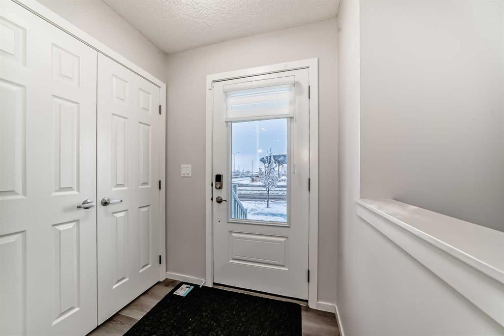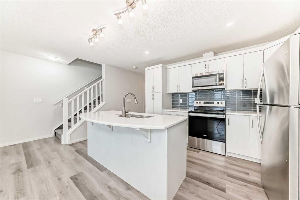 NO CONDO FEES in the over 1439 sq ft, 3 bdrm, 2.5 bath townhouse, with dbl attached garage. If you are looking to own your first home that is affordable and feels like new, look no further. Walking in, you will enjoy the open floor plan, vinyl plank flooring, a beautiful white kitchen with quartz counters, SS appliances, and a kitchen island with seating for 3. There’s a 2-piece bathroom on the main as well as a mud room area before entering the double attached garage. Upstairs features 3 bedrooms. The primary bdrm will fit your king-size bed and has a 4-piece ensuite bath with quartz counters and a soaker tub. The walk-in closet is huge, bigger than many large homes. The other 2 bdrms are a good size, as well as a laundry room and another 4-piece bathroom with quartz and a soaker tub. The downstairs is plumbed for the bathroom, it’s ready to go. There’s a fresh air system added. The best part is it’s conveniently located to No Frills, gas, restaurants, Purple Potomus preschool learning, schools and much more. The bus route is close by, with easy access to Stoney Trail, and the shopping center in Coventry Hills is 5 minutes away, with Superstore, Canadian Tire, Dollarama, Shoppers Drug Mart, Winners, Michaels, Staples, Home Depot, Vivo Recreation Center, IMAX movie theatre, many restaurants, and excellent stores. It’s a win-win-win in any way that you look at it. priced sharply, and quick possession available.