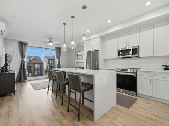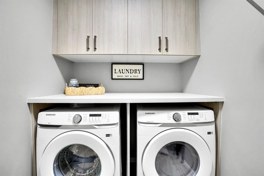 The thoughtfully designed interior showcases a bright and open main living area. The balcony overlooks a serene courtyard, creating a peaceful backdrop for morning coffee or evening relaxation. The side-by-side laundry with built-in cabinetry adds both storage and practicality—an often-overlooked luxury that enhances daily living. Car enthusiasts and growing families will appreciate the double attached garage with durable epoxy coating, plus an additional third titled parking stall—a rare offering and one of the few units in the complex to provide this added convenience. The complex backs onto a tranquil pond and you’re just steps from the scenic pathways along the Bow River. Morning walks, sunset bike rides, weekend strolls — all built into your lifestyle. And with easy access to major roadways and amenities, convenience is always on your side.