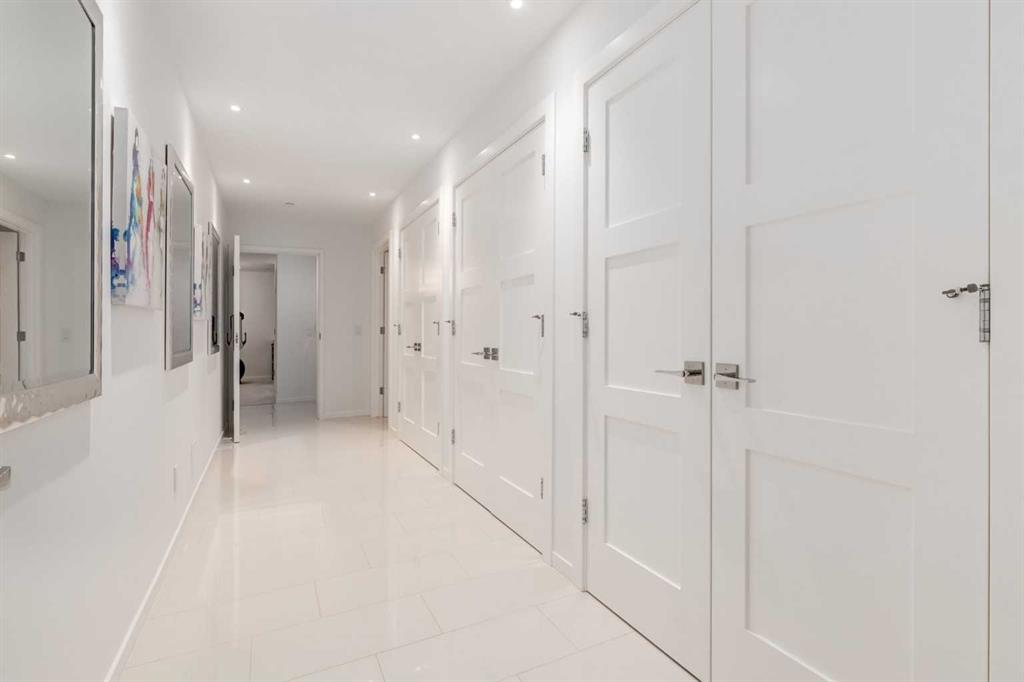 The View at the Edge embodies modern architecture at its peak—framing Calgary’s downtown skyline, Bow River & Rocky Mountain views from every level while uniting precision design, comfort & function across nearly 8,000 sqft of refined living. A sculptural façade opens to soaring spaces anchored by 2 elegant fireplaces—a wood-burning hearth welcoming guests near the front and a gas feature wrapped in contemporary stone at the rear. From the front entry, wide-plank engineered hardwood guides you through the chef’s kitchen, where Miele appliances, steam & speed ovens, built-in espresso bar, dual dishwashers & a waterfall quartz island set the stage for culinary artistry. The kitchen flows naturally into the dining area, which opens through bifold glass doors to a heated patio—a private, low-maintenance extension of the living space designed for effortless entertaining and relaxation. Upstairs, the primary suite commands the home’s most breathtaking vantage—floor-to-ceiling windows framing the Bow River, downtown skyline & Rocky Mountains in one sweeping view. Dual dressing rooms & a spa ensuite w/ heated floors, freestanding tub & glass shower w/ steam system complete the retreat. 2 additional bedrooms—one concealing a soundproof, secure safe walk-in closet behind disguised shelving—share a full bath & a luxurious laundry room w/ extensive cabinetry, quartz counters & sink. Throughout the baths, sculptural faucets and fixtures elevate every detail. The top level blends productivity & leisure: a bonus room, 2 offices, a wet bar beside a corner library, and a rooftop terrace engineered for four-season comfort. Retractable screens, adjustable louvres, built-in heaters & gas line transform it into an outdoor living room showcasing one of the best views in Crescent Heights—a triple panorama of city, river & mountains few properties can match. Below grade, discover a soundproof music studio w/ double doors; a gym, office, recreation lounge & bar, each warmed by hydronic in-slab radiant heating powered by an efficient boiler system. A 2nd laundry area, extra refrigeration & dedicated storage (incl. a locked storage room) deliver everyday practicality to match the home’s grandeur.