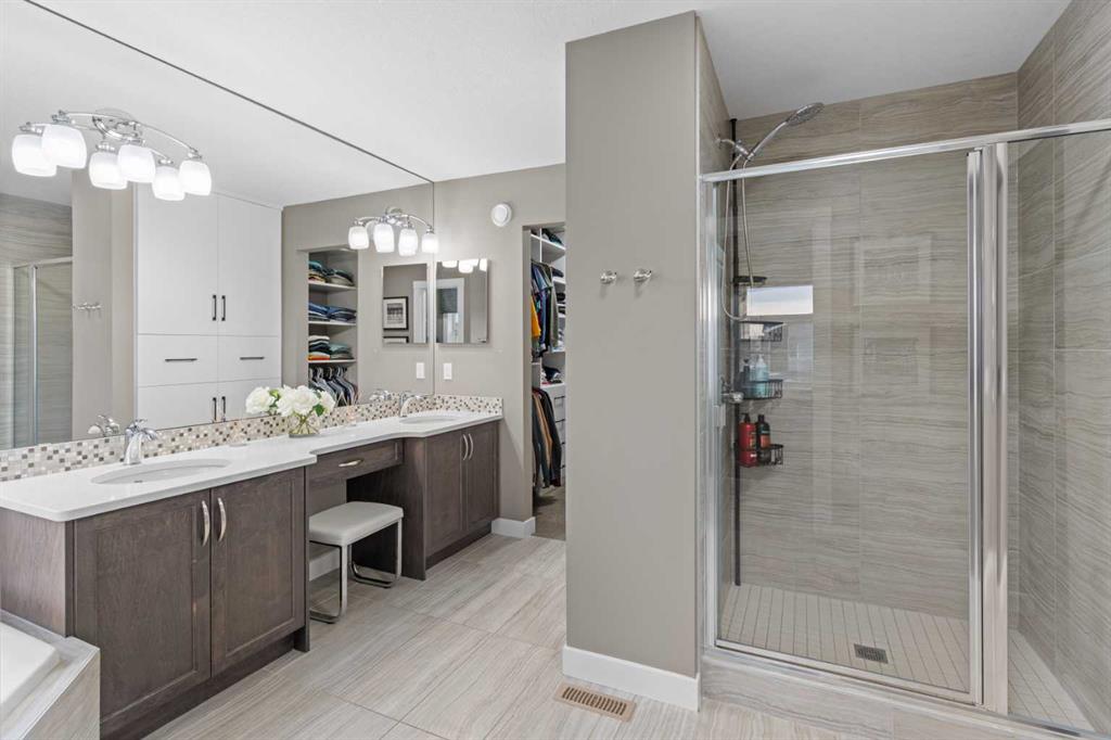 Upstairs, the home opens into a massive family room that is ideal for gatherings or relaxing. Four generously sized bedrooms provide ample space, while the thoughtfully designed laundry room includes custom counters and cabinetry. The primary suite is a true retreat, featuring a spa-like ensuite with double vanity, a mirror extended to the ceiling, a stand-up shower, a relaxing soaker tub, and a large walk-in closet with custom cabinetry. The additional three bedrooms are bright, comfortable, and offer excellent closet space.