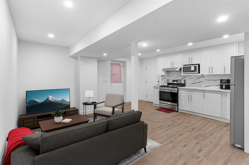 The recently developed basement features a legal two-bedroom suite with its own full kitchen, stainless steel appliances, separate laundry, comfortable living area, and a three-piece bathroom, which is perfect for extended family or rental income.
