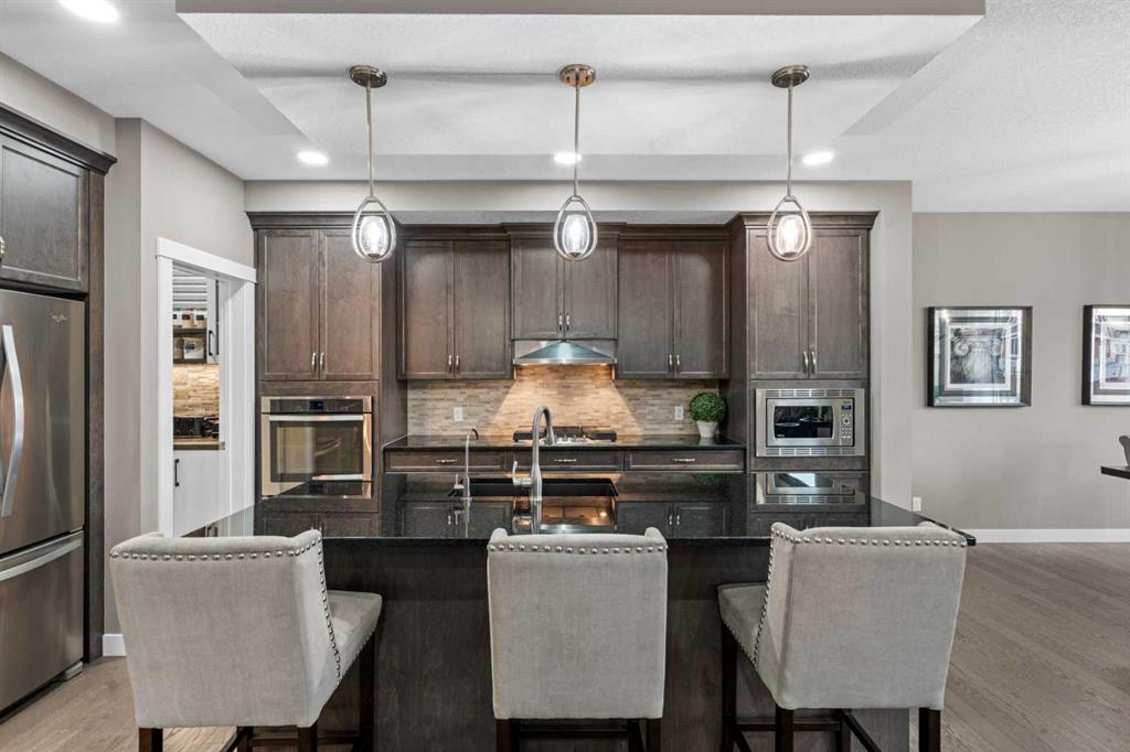 This impressive home offers a double attached garage, four spacious bedrooms, two and a half bathrooms, and a newly developed two-bedroom LEGAL SECONDARY SUITE. From the moment you step inside, the grand entrance with high ceilings sets the tone for the elegance that follows. The main floor features a chef-inspired kitchen with built-in stainless steel appliances, custom cabinetry with crown molding, a large central island, and a walk-through butlers pantry with additional custom storage. A formal dining room, casual dining nook, bright and luxurious living room with a gas fireplace, functional mudroom, and a convenient two-piece bathroom complete the main level.