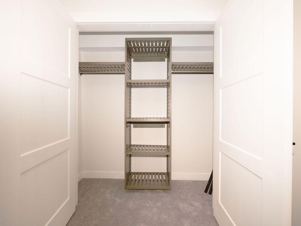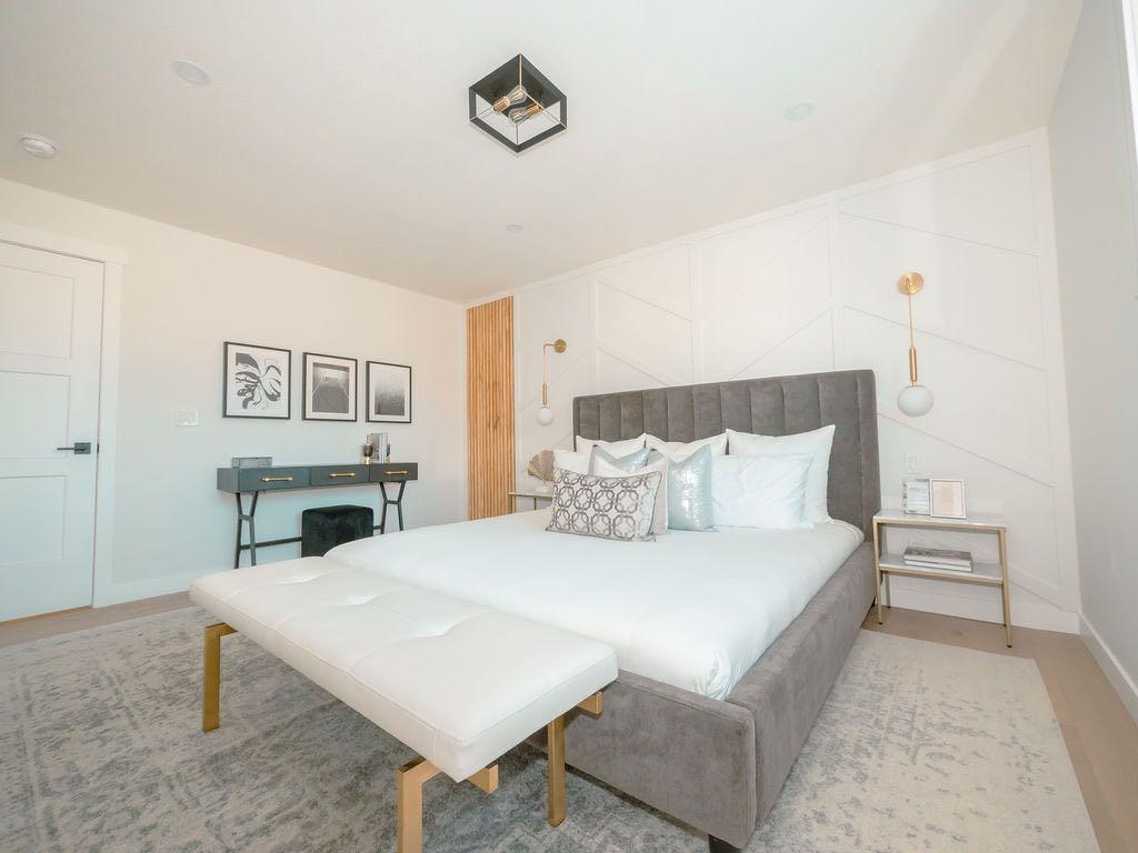 Don’t be deceived by the exterior; this home offers surprisingly spacious rooms. The master suite is a true retreat, measuring 14’5″x11’8″. It features a luxurious full ensuite, also part of the home’s comprehensive renovation, complete with dual sinks, a beautifully tiled glass shower, a separate soaker tub, and a walk-in closet outfitted with custom shelving.