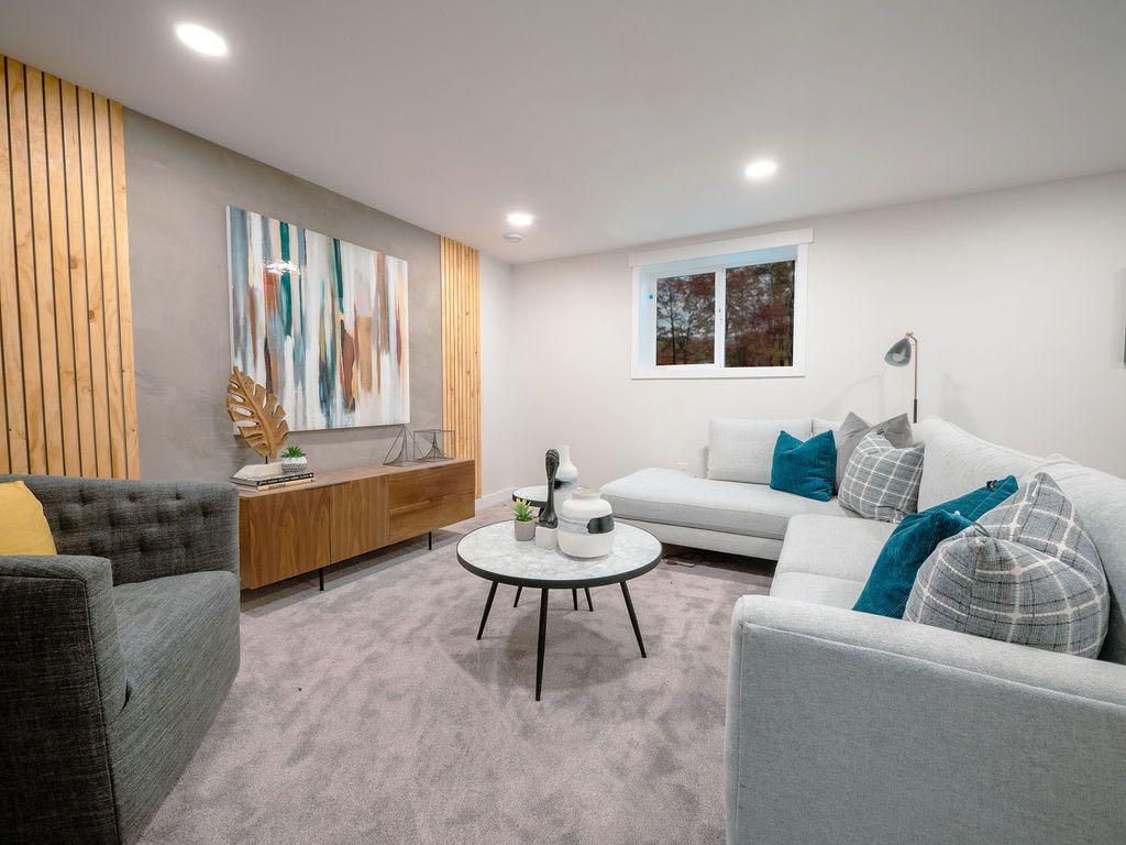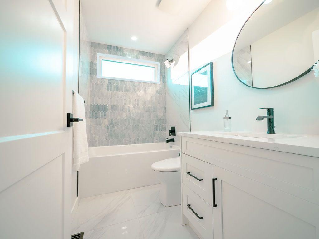 Descend to the fully finished basement to discover an expansive family room, perfect for entertaining or relaxing. This level, also fully renovated, houses a stylish laundry room, a full bathroom with a tiled glass shower, and two additional generously sized bedrooms. The layout here offers excellent potential to create an in-law suite or a separate second unit by adding a kitchen, A secondary suite would be subject to approval and permitting by the city/ municipality.