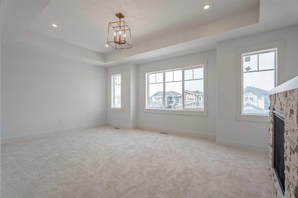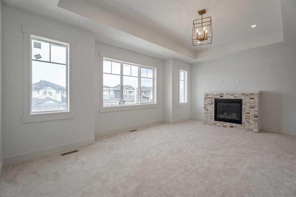 Upstairs are three bedrooms, including a grand primary retreat accessed through elegant double doors, measuring 15’9″ x 14′ and featuring a raised tray ceiling, large walk-in closet with wood shelving, and a spa-inspired 5-piece ensuite with double vanity. A bonus room with tray ceiling and gas fireplace, a convenient laundry room, and a 4-piece main bath add even more functionality.