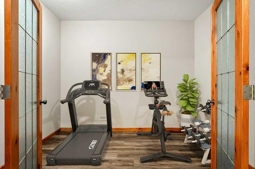 The fully finished lower level (builder developed) provides LVP flooring, 9′ knockdown ceilings and a large recreation room anchored by a second stone gas fireplace (renovated 2020) with built-in cabinetry, speakers and shelving. The lower level includes a 4th bedroom/office, a tiled 3-piece bath, an enclosed exercise area and a service/storage room that houses two brand-new hot water tanks, Kolher Konnect water monitoring system installed in October 2024 and a recirculating pump as an added feature. Mechanical upgrades include two forced-air furnaces, two A/C units, a water softener and a newly installed built-in vacuum system.
