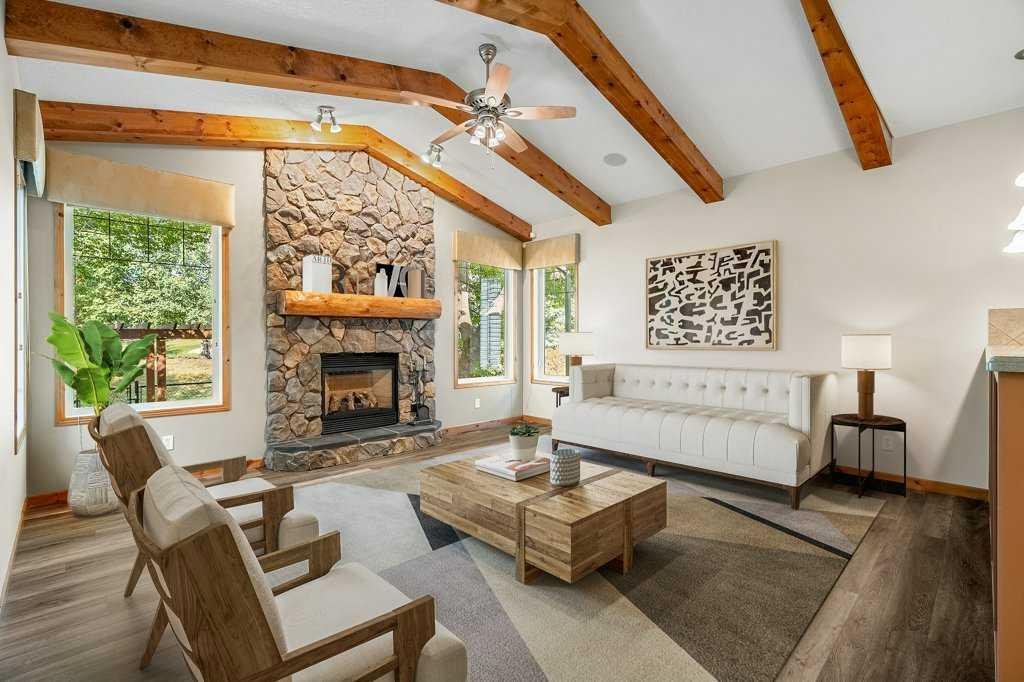 The main floor showcases above-cabinet lighting, tiled entry and 9′ knockdown ceilings. The open kitchen features extended-height cabinetry, a corner pantry, banks of drawers, a center island with storage, tiled backsplash and brand-new appliances including a Samsung refrigerator, KitchenAid slide-in induction cooktop range, Samsung dishwasher, and a new range hood. , r/o water system. The living room includes vaulted ceiling with wood beams, a floor-to-ceiling stone gas fireplace with log mantle, built-in bookshelves, LVP flooring and integrated speakers. Additional main-floor spaces include a front den with LVP (2020), a mudroom with laundry, broom/book storage closets, a 2-piece bath and a double attached garage with a new garage door. Exterior and entry updates include a new front door, new rear door and new shingles (2023); eaves with guards were replaced in 2024.