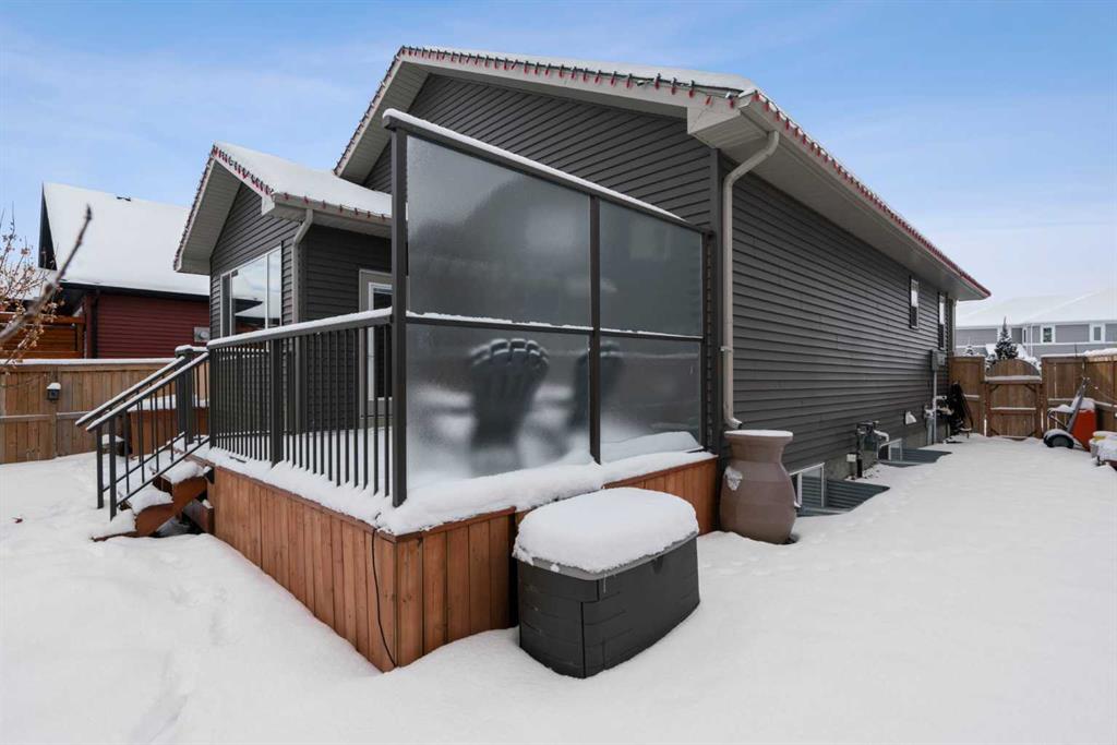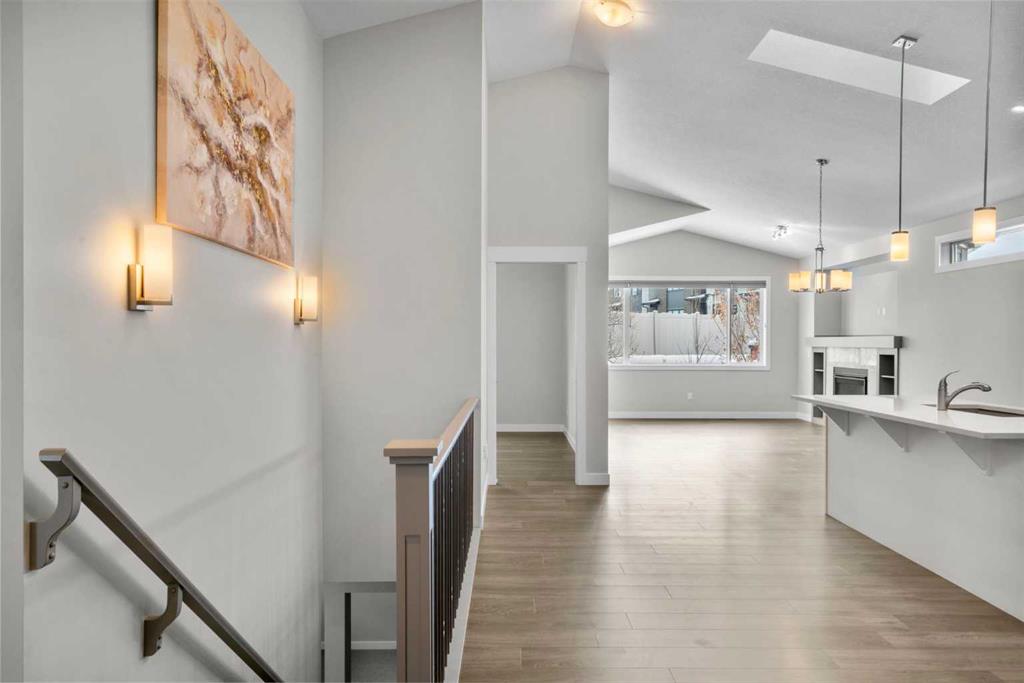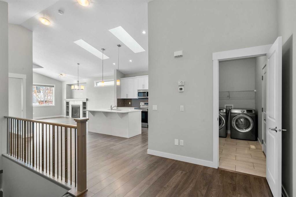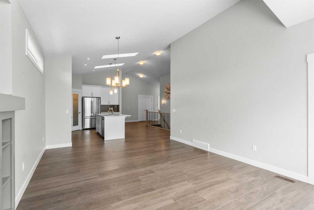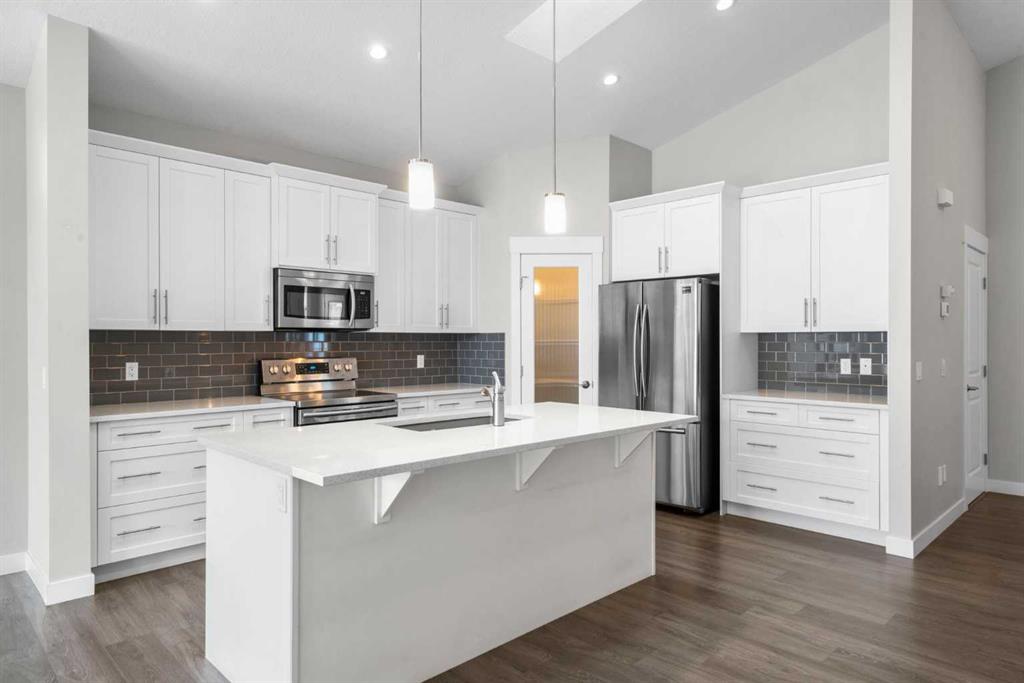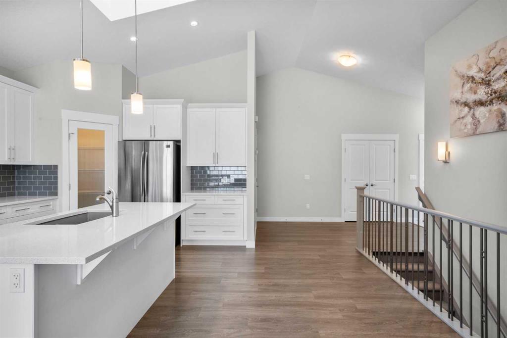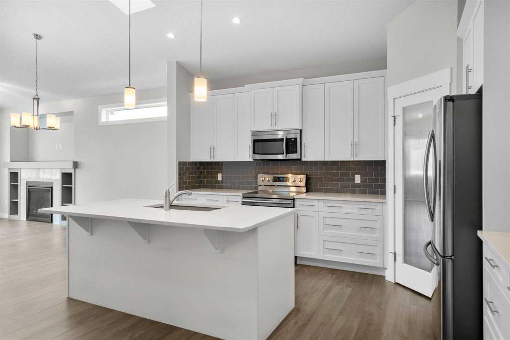 WELCOME HOME! Discover this inviting and fully developed bungalow in the sought-after community of Drake Landing. Set on a generous pie shaped lot, the property’s standout feature is the impressive oversized double garage with soaring 13-ft ceilings. Inside, the main level is bright and welcoming thanks to its vaulted ceilings, expansive windows, and two skylights that pour in natural light. The kitchen is designed for both style and function, highlighted by tall cabinetry, quartz countertops, a large central island, and stainless steel appliances. The adjacent dining area and comfortable living room with its fireplace and built in mantle. Outdoor living is just as enjoyable, with a large back deck for grilling and a spacious concrete patio perfect for evenings around a firepit. The primary bedroom offers a quiet retreat with a walk-in closet and a 5 pc. ensuite featuring a deep soaker tub, oversized shower, double sinks, and quartz counters. A handy mud/laundry room with built-ins, along with a half bath, complete the main floor. Downstairs, the professionally finished basement provides 9-ft ceilings, a huge recreation area, plenty of windows, 2 roomy bedrooms, and a full 4 pc. bathroom. A good sized storage room ensures you have all the space you need. The yard is set up with low-maintenance landscaping, and the home shows exceptional care from top to bottom. If you’ve been searching for a bungalow with standout garage space and a move-in-ready interior, this one is worth a look!