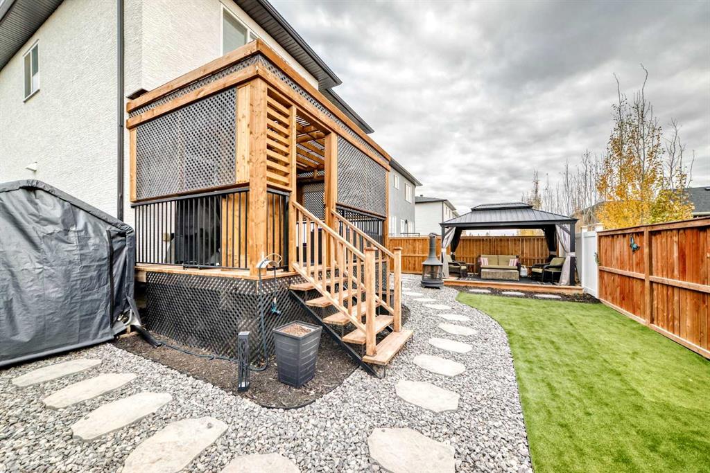 surround with tile and contemporary shelving. This home boasts the addition of central air conditioning to keep you cool on all those hot summer nights. Enhanced with built-in kitchen and primary bedroom ceiling speakers roughed in for your future hidden sound system. French doors lead to a versatile main floor office/extra bedroom, offering flexibility for your lifestyle. Upstairs, the luxurious primary suite boasts a spa-like 5-piece ensuite with granite counters, a jetted tub, and a tiled shower. Two additional bedrooms, a full bathroom, and a wonderful bonus room for your extra large screen tv to provide a special space for family living, movie nights, or playtime. Step outside into your maintenance-free backyard retreat, featuring a pergola-covered deck, a separate gazebo for quiet getaways, and a cozy corner swing, all surrounded by artificial grass, decorative stones, and paving stones for easy upkeep. There’s extra storage space and a dog run along the side yard and a separate entrance to the basement, offering even more flexibility. Car enthusiasts, hobbyists, or fitness lovers will be thrilled by the triple car garage, a true stunner with room for vehicles, tools, and exercise equipment. Located within walking distance to schools, parks, medical offices, the library, and Carstairs’ finest restaurants. This home truly has it all. And with Calgary just 30 minutes away, you’ll enjoy the perfect balance of small-town charm and city convenience. DON’T MISS YOUR CHANCE TO OWN THIS STUNNING HOME! SCHEDULE YOUR SHOWING TODAY.