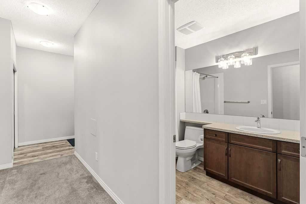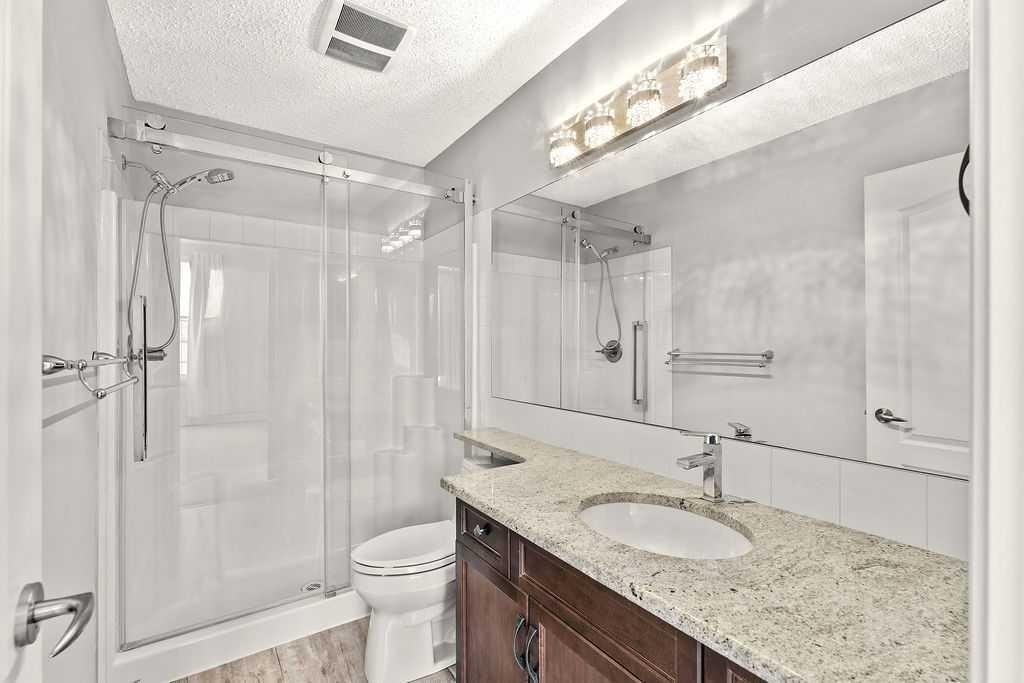 The primary bedroom offers a peaceful retreat, complete with upscale lighting and a beautifully appointed ensuite. Enjoy a spacious walk-in shower with glass doors and a detachable oversized shower head, along with a large vanity featuring gleaming granite countertops and excellent storage.