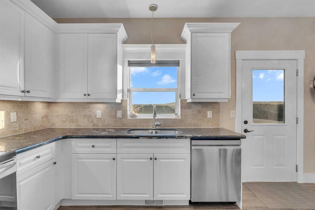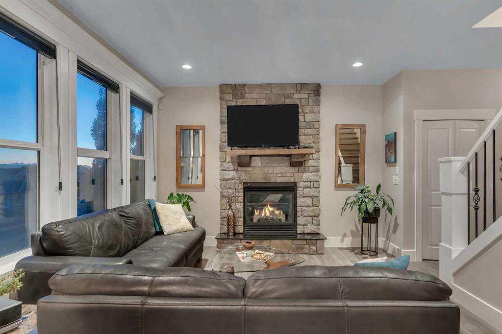 Inside, the open-concept main floor is bright and welcoming. The living room features a striking floor-to-ceiling rock fireplace, creating a warm focal point for everyday living or entertaining. Large windows flood the space with natural light and frame stunning mountain and hill views. The dining area flows into a spacious kitchen with granite countertops, sleek stainless steel appliances, travertine tile, and plenty of cabinetry. A convenient powder room and access to the deck with glass railings allow you to take in the full, unobstructed view while enjoying privacy and outdoor living. Upstairs, the primary suite feels like a private retreat with vaulted ceilings, generous space for a king bed, and more west-facing views. A well-appointed ensuite and walk-in closet add comfort and convenience. Two great-sized additional bedrooms, a full bathroom, and a laundry room complete the upper level, making it an excellent layout for families or guests. The fully finished walk-out basement provides flexibility, featuring a large rec room, full bathroom, and potential for a separate living area with its own access and a parking area off the back lane. This space can be used for guests, hobbies, a home office, or additional living quarters. Throughout the home, thoughtful upgrades stand out, such as new vinyl flooring, fresh paint, tall baseboards, crown moulding around door frames, and abundant windows that keep every room light and bright. Outside, the walk-out level opens to a landscaped yard with extensive rockwork and level green space. A hot tub sits just steps away, and below is a lower garden area with mature shrubs where you can gaze up and admire your surroundings. Located in Heritage Hills, near a newly proposed grocery store and close to local schools, this property combines privacy and convenience with quick access to Highway 1A for easy mountain getaways. This is where comfort meets breathtaking views, creating the perfect place to call home. Experience the beauty and calm of Heritage Hills living.